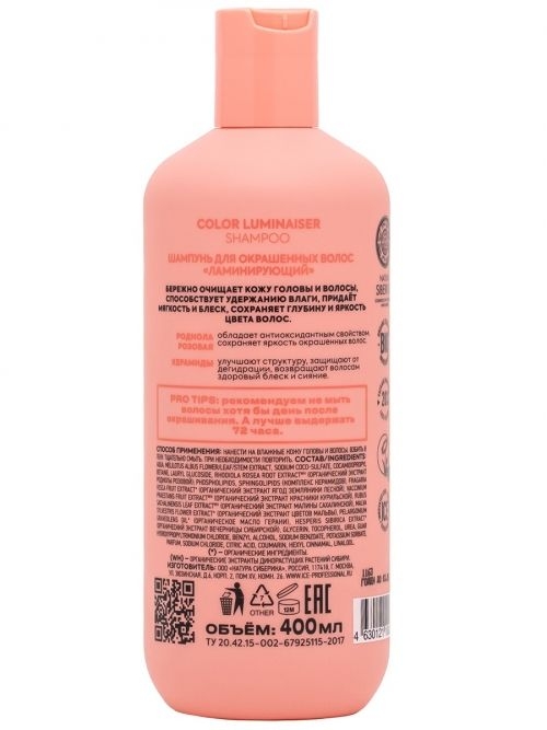 Шампунь для окрашенных волос ламинирующий бережно очищает кожу головы и волосы, способствует удержанию влаги, придаёт мягкость и блеск, сохраняет глубину и яркость цвета волос.