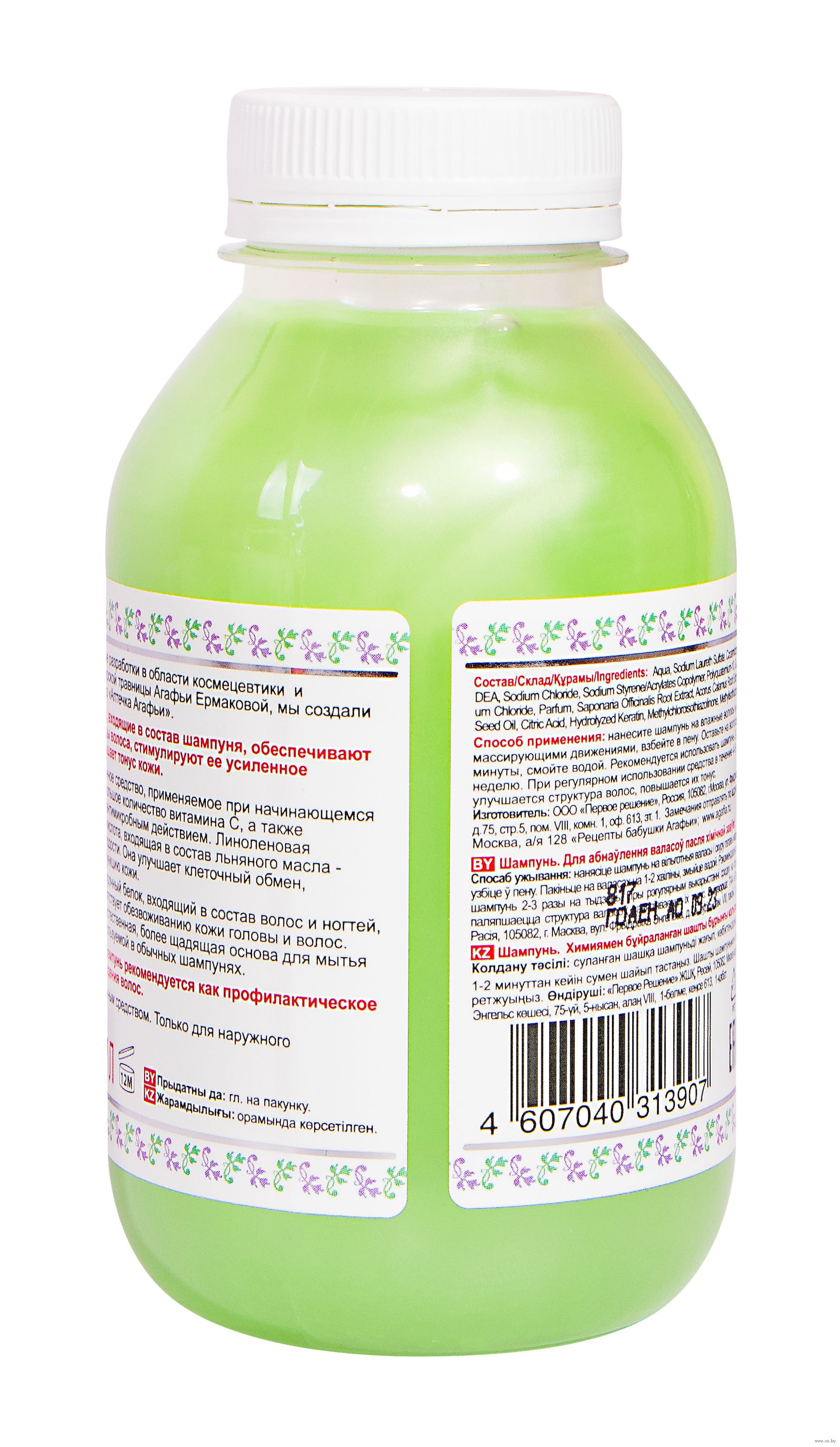 Aктивные компоненты, входящие в состав шампуня, обеспечивают оздоровление луковицы волоса, стимулируют ее усиленное кровоснабжение, повышают тонус кожи. Корень аира – традиционное средство, применяемое при начинающемся облысении. Содержит большое количество витамина С, а также обладает выраженным антимикробным действием. Линоленовая ненасыщенная жирная кислота, входящая в состав льняного масла – природный эликсир молодости. Она улучшает клеточный обмен, укрепляет барьерную функцию кожи. Кератин – эластичный, прочный белок, входящий в состав волос и ногтей, удерживает влагу, препятствует обезвоживанию кожи головы и волос