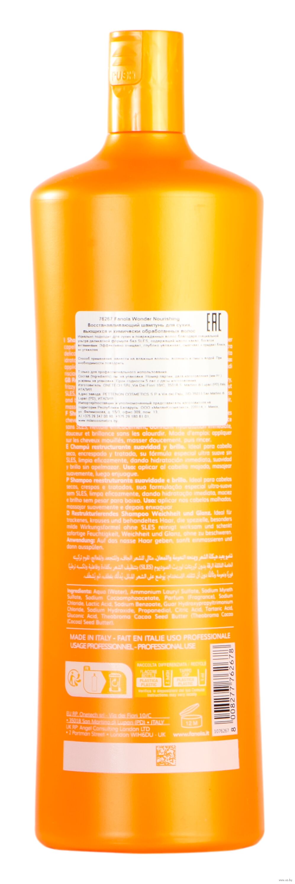 Нанесите шампунь на влажные волосы, вспеньте и тщательно смойте водой. При необходимости повторите процедуру. Для лучшего результата используйте вместе с кондиционером Fanola Wonder Nourishing для более интенсивного увлажнения и питания.Состав