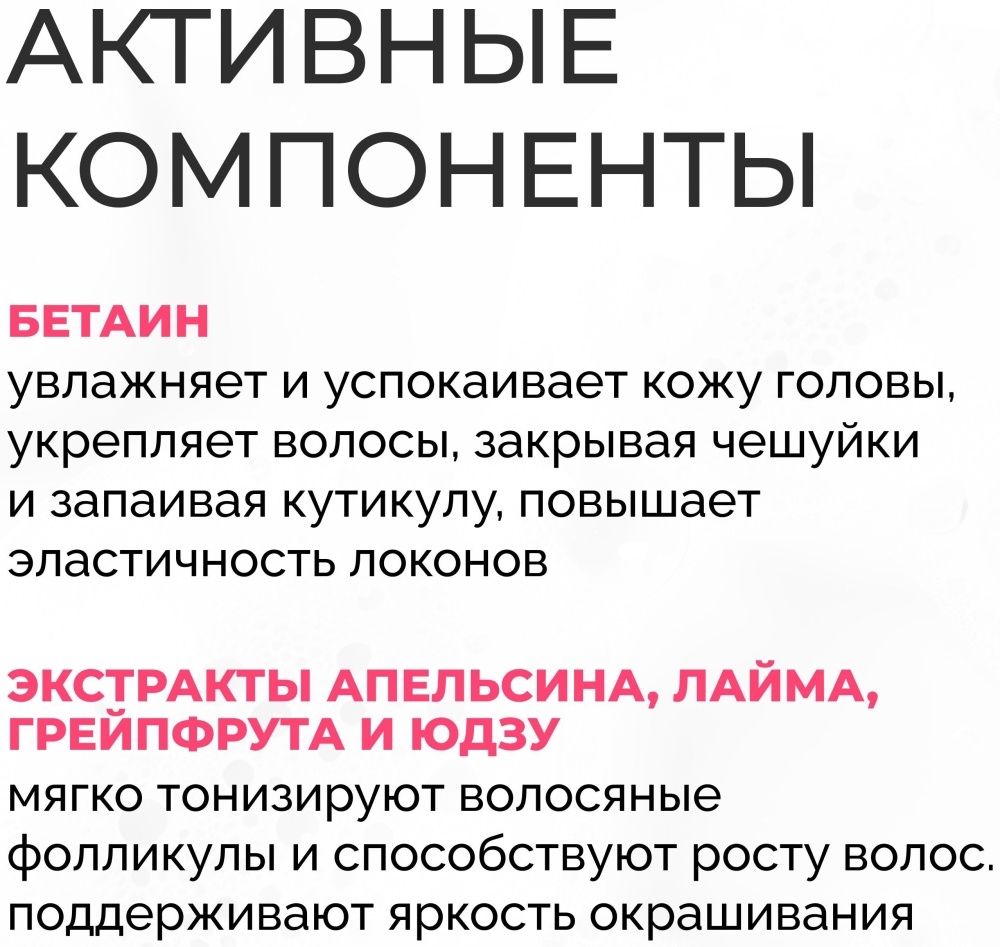 Aqua, Sodium Laureth Sulfate, Cocamidopropyl Betaine, Sodium Cocoamphoacetate, Lauryl Glucoside, Styrene/Acrylates Copolymer, Glycerin, Sorbitol, Parfum, PEG-7 Glyceryl Cocoate, Citric Acid, Sodium Chloride, Hydroxypropyl Guar Hydroxypropyltrimonium Chloride, Silicone Quaternium-18, Polyquaternium-10, Сitrus Aurantium Dulcis (Sweet Orange) Fruit Extract, Citrus Grandis (Grapefruit) Fruit Extract, Citrus Limon Fruit Extract, Citrus Aurantifolia (Lime) Fruit Extract, Citrus Reticulata (Mandarin) Fruit Extract, Citrus Junos Fruit Extract, Disodium EDTA, Benzophenone-4, Betaine (Trimethyl Glycine), Collagen, Acetic Acid, Phenoxyethanol, Caprylyl Glycol, Chitosan, Methylchloroisothiazolinone, Methylisothiazolinone, Sodium Benzoate, Potassium Sorbate.