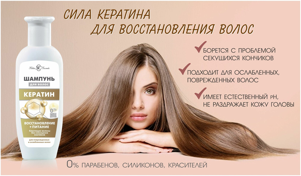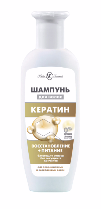 Подходит для всех типов волос, особенно для повреждённых и ослабленных. Кератин усиливает плотность и эластичность волос.