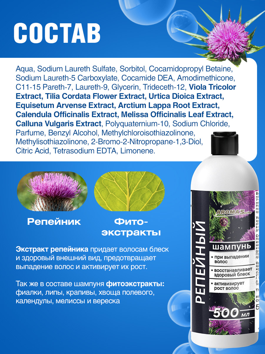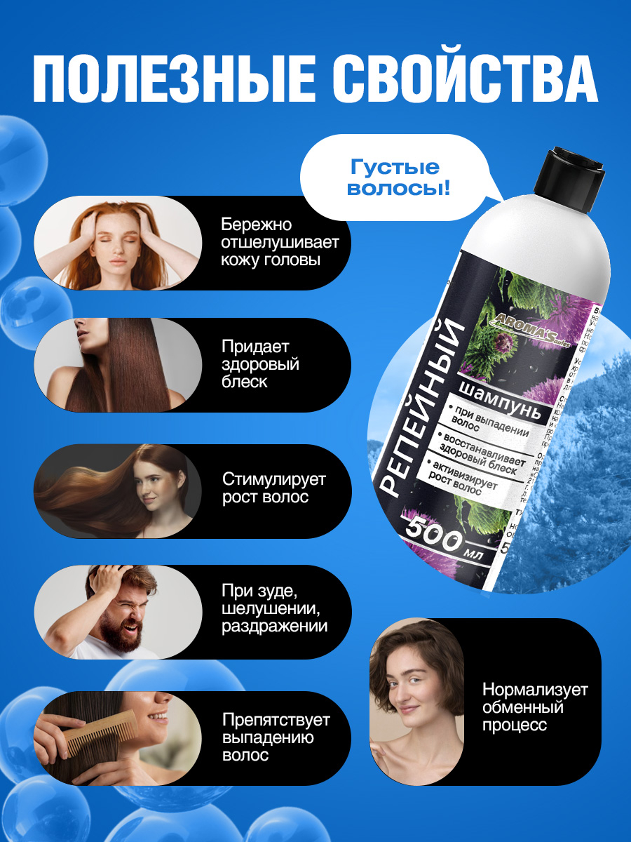 Шампунь "Репейный" на основе натурального масла репейника придает волосам блеск и здоровый внешний вид, предотвращает выпадение волос и активирует их рост.