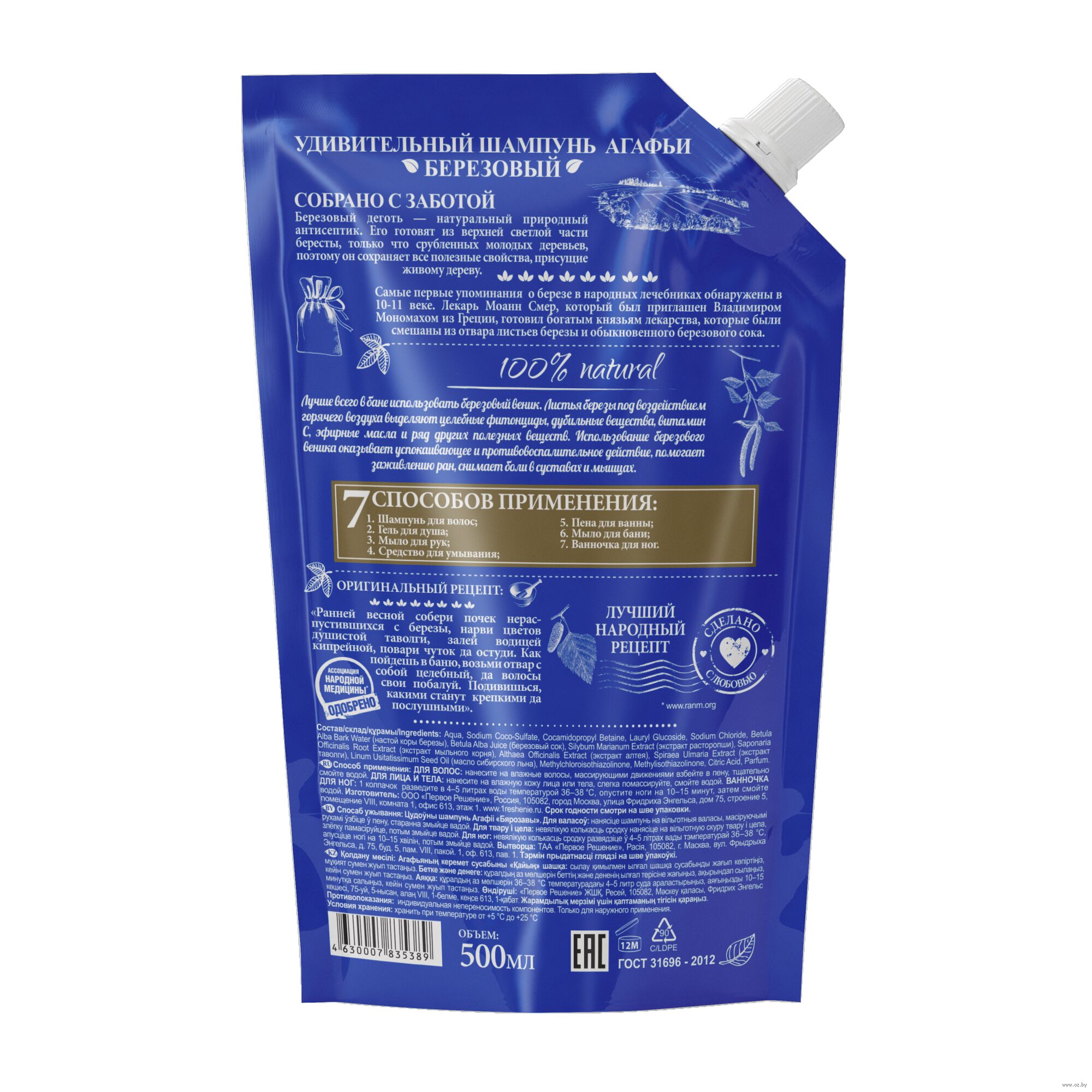 Aqua, Sodium Coco-Sulfate, Cocamidopropyl Betaine, Lauryl Glucoside, Sodium Chloride, Betula Alba Bark Water (настой коры березы), Betula Alba Juice (березовый сок), Silybum Marianum Extract (экстракт расторопши), Saponaria Officinalis Root Extract (экстракт мыльного корня), Althaea Officinalis Extract (экстракт алтея), Spiraea Ulmaria Extract (экстракт таволги), Linum Usitatissimum Seed Oit (масло сибирского льна), Methylchloroisothiazolinone. Methylisothiazolinone, Citric Acid, Parfum.