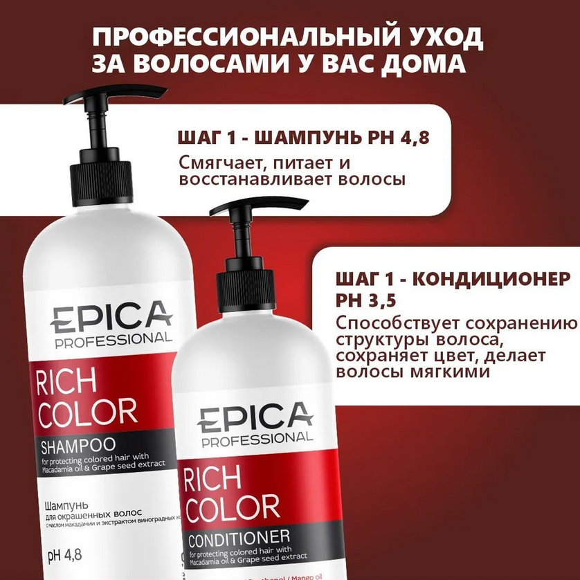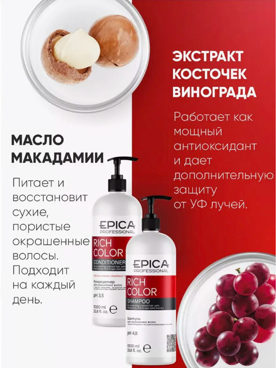 Rich Color Shampoo (шампунь для окрашенных волос, 1000 мл) – шампунь с маслом макадамии и экстрактом виноградных косточек смягчает, питает и восстанавливает волосы, оказывает антиоксидантное воздействие и дает дополнительную защиту от УФ-лучей. Подходит для окрашенных волос, сохраняет цвет, делает волосы мягкими и шелковистыми.
