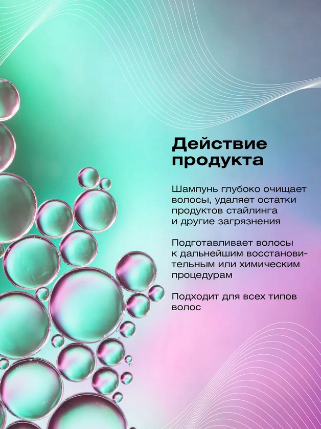 Шампунь глубоко очищает волосы, удаляет остатки продуктов стайлинга и другие загрязнения. Подготавливает волосы к дальнейшим восстановительным или химическим процедурам. Бетаин восстанавливает поврежденные участки волос, придает блеск и мягкость. Подходит для всех типов волос.