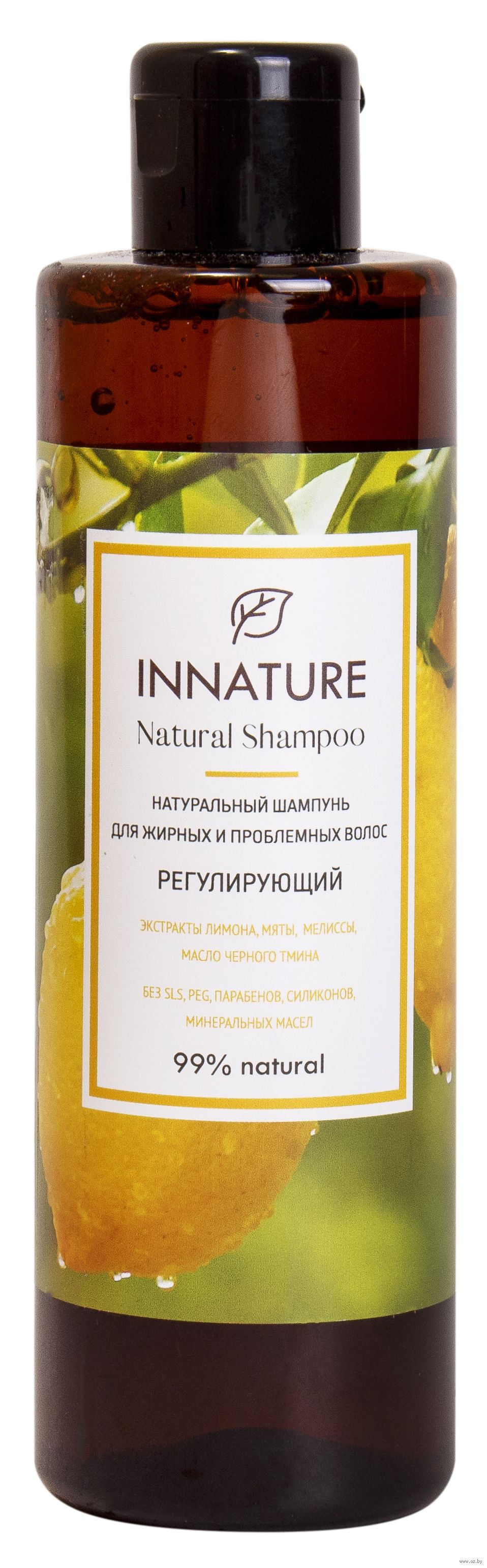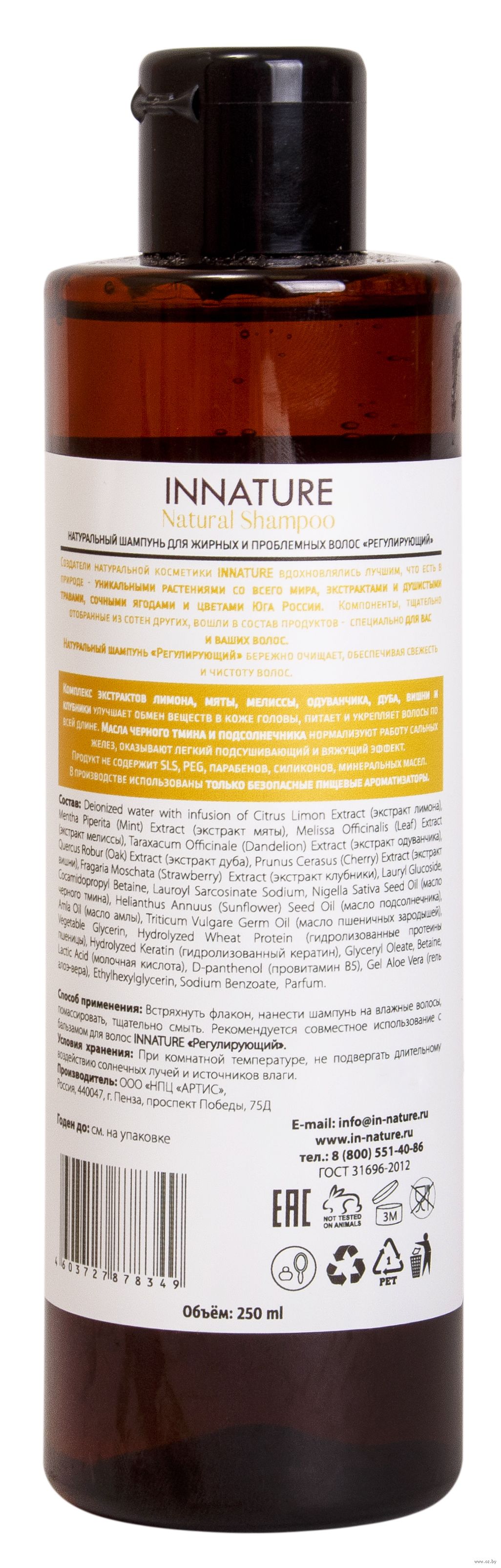 Встряхнуть флакон, нанести шампунь на влажные волосы, помассировать, тщательно смыть. Рекомендуется совместное использование с бальзамом для волос "INNATURE. Регулирующий".Состав