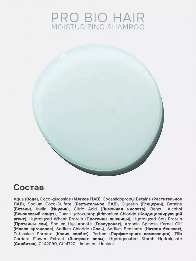 Аqua (вода), coco-glucoside (мягкое пав), cocamidopropyl betaine (растительное пав), sodium coco-sulfate (растительное пав), glycerin (глицерин), betaine (бетаин), inulin (инулин), citric acid (лимонная кислота), benzyl alcohol (бензиловый спирт), guar hydroxypropyltrimonium chloride (кондиционирующий агент), hydrolyzed wheat protein (протеины пшеницы), hydrolyzed soy protein (протеины сои), sodium hyaluronate (гиалуронат), argania spinosa kernel oil (масло аргановое), sodium chloride (соль), sodium benzoate (натрия бензоат), postassium sorbate (калия сорбат), parfum (парфюмерная композиция), tilia cordata flower extract (экстракт липы), hydrogenated starch hydrolysate (сорбитол), ci 42090, ci 14720, limonene, linalool.