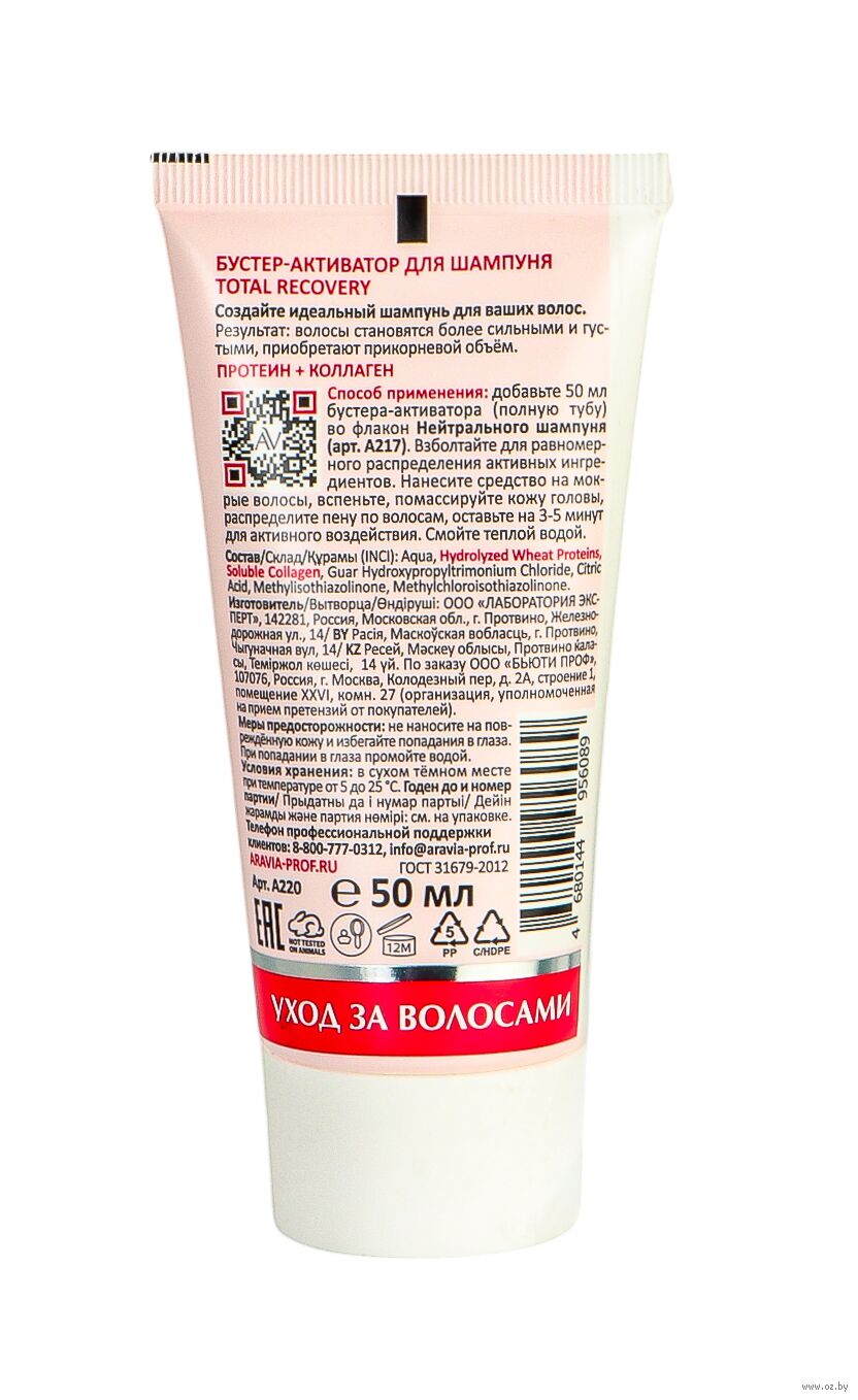 Добавьте 50 мл бустера-активатора (полную тубу) во флакон Нейтрального шампуня (артикул А217). Взболтайте для равномерного распределения активных ингредиентов. Нанесите средство на мокрые волосы, вспеньте, помассируйте кожу головы, распределите пену по волосам, оставьте на 3-5 минут для активного воздействия. Смойте теплой водой.Состав