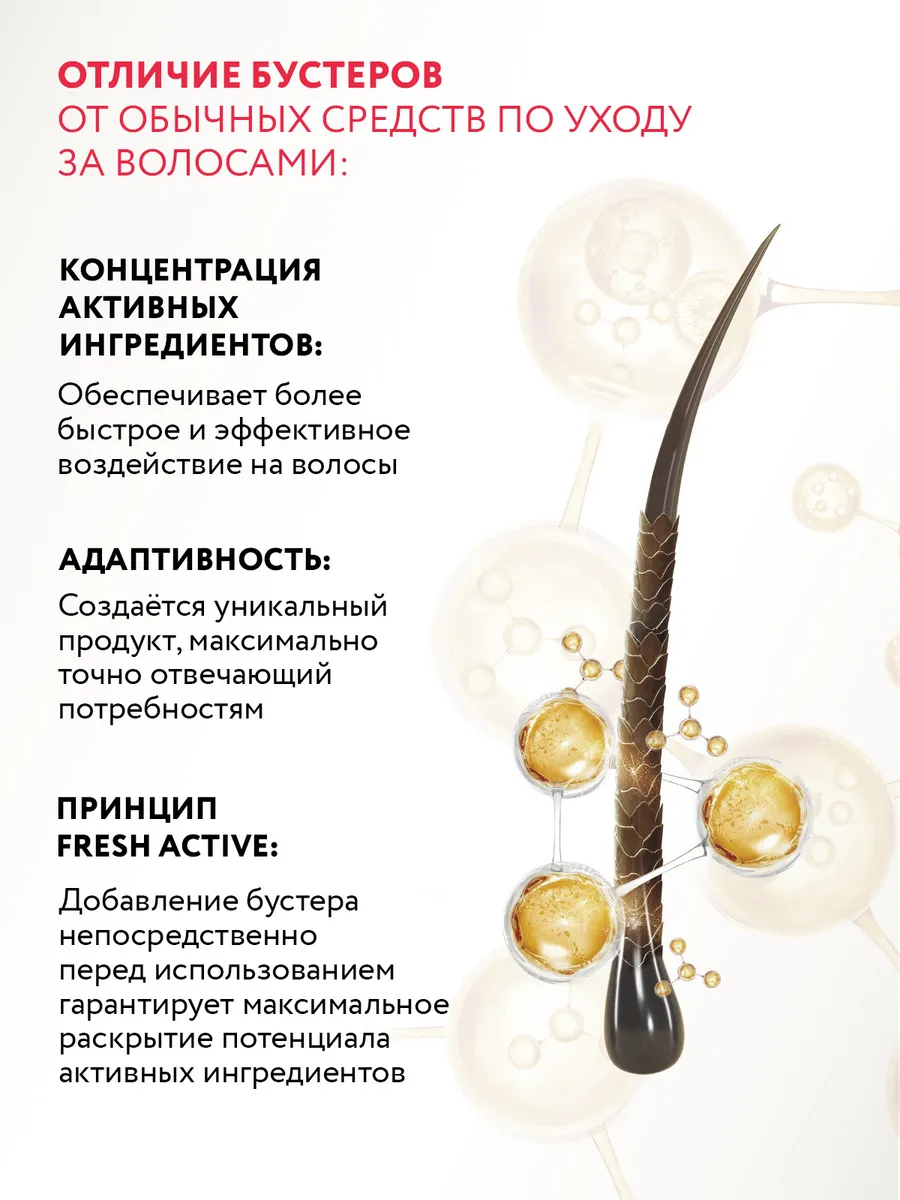 Бустер-активатор – концентрат активных ингредиентов. Усиливает эффект от применения шампуня и кондиционера, решает конкретные запросы. Мощная и целевая формула направлена на максимальное воздействие.