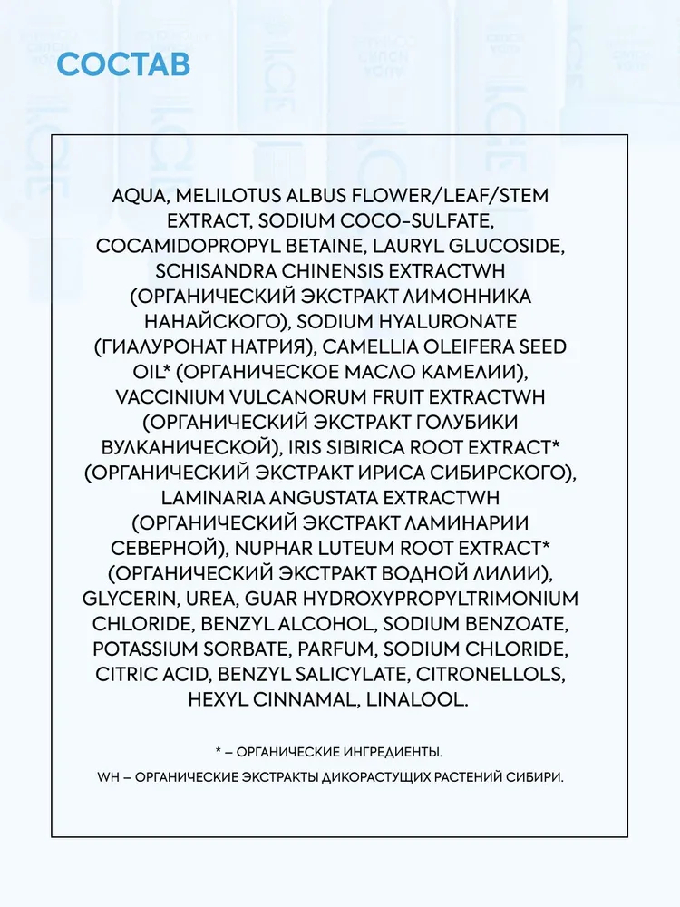 Aqua, Melilotus Albus Flower Leaf Stem Extract, Sodium Coco-Sulfate, Cocamidopropyl Betaine, Lauryl Glucoside, Schisandra Chinensis Extractwh (органический экстракт лимонника нанайского), Sodium Hyaluronate (гиалуронат натрия), Camellia Oleifera Seed Oil (органическое масло камелии), Vaccinium Vulcanorum Fruit Extractwh (органический экстракт голубики вулканической), Iris Sibirica Root Extract (органический экстракт ириса сибирского), Laminaria Angustata Extractwh (органический экстракт ламинарии северной), Nuphar Luteum Root Extract (органический экстракт водной лилии), Glycerin, Urea, Guar Hydroxypropyltrimonium Chloride, Benzyl Alcohol, Sodium Benzoate, Potassium Sorbate, Parfum, Sodium Chloride, Citric Acid, Benzyl Salicylate, Citronellols, Hexyl Cinnamal, Linalool.Мы используем файлы cookie для обеспечения удобства работы с сайтом и его контакта с пользователем.