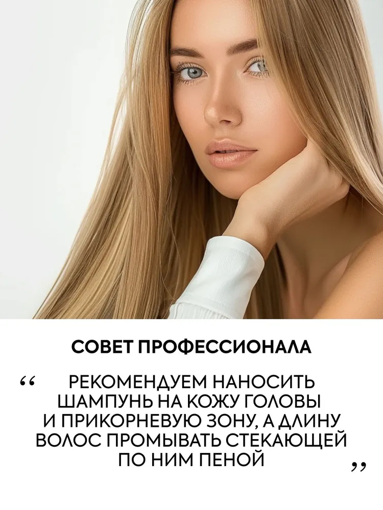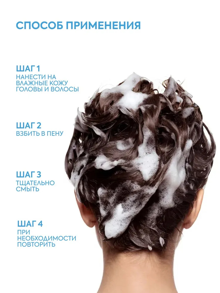 Нанести на влажные кожу головы и волосы. Взбить в пену. Тщательно смыть. При необходимости повторить.Состав