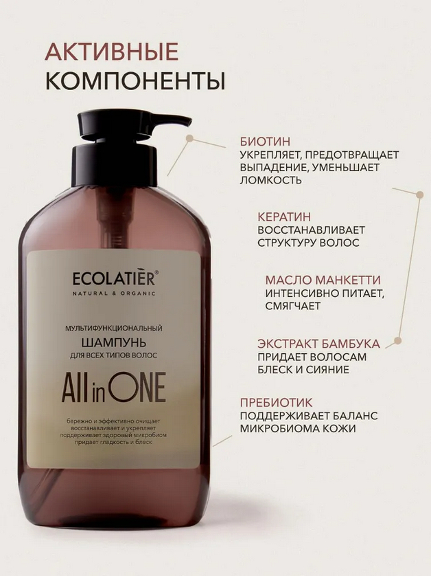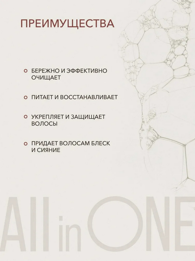 Шампунь для всех типов волос "All In One" – это мультифункциональное средство, разработанное для эффективного очищения и ухода за волосами и кожей головы.