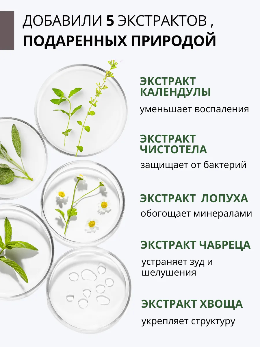 Вода очищенная, кокамидопропилбетаин, лаурентсульфат натрия, децил глюкозид, диэтаноламид жирных кислот кокосового масла, поликватерниум-7, моностеарат глицерина, масло репейное, СО2 экстракт чабреца, СО2 экстракт лопуха, СО2 экстракт хвоща, СО2 экстракт чистотела, СО2 экстракт календулы, силиконовая микроэмульсия, деготь березовый, пантенол, салициловая кислота, глицерин, бензиловый спирт, сорбиновая кислота, бензойная кислота.