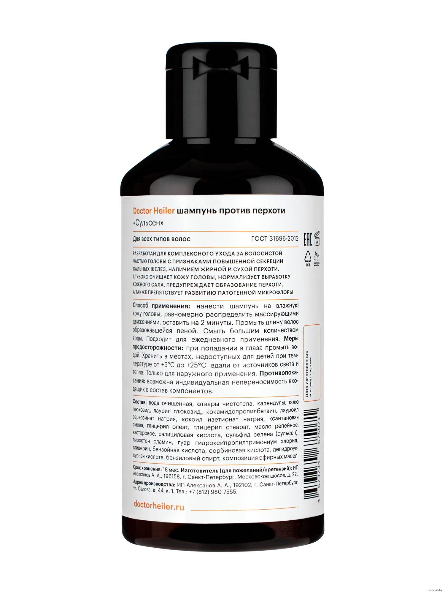 Вода очищенная, отвары чистотела, календулы, коко глюкозид, лаурил глюкозид, кокамидопропилбетаин, лауроил саркозинат натрия, кокоил изетионат натрия, ксантановая смола, глицерил олеат, глицерил стеарат, масло репейное, касторовое, салициловая кислота, сульфид селена (сульсен), пироктон оламин, гуар гидроксипропилтримониум хлорид, глицерин, бензойная кислота, сорбиновая кислота, дегидроуксусная кислота, бензиловый спирт, композиция эфирных масел.