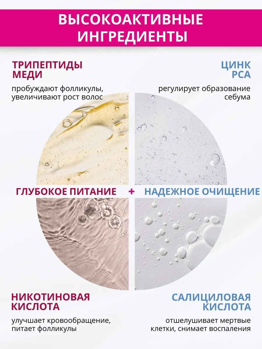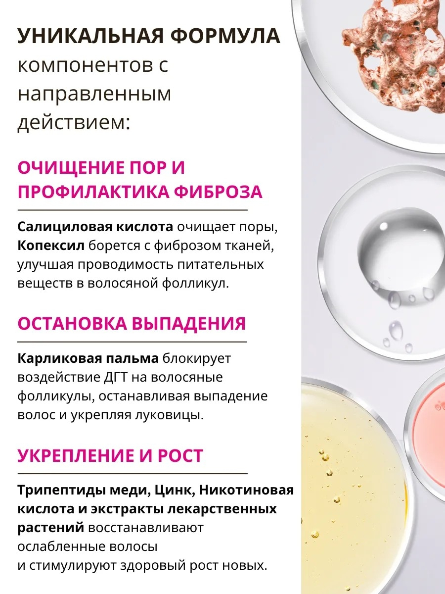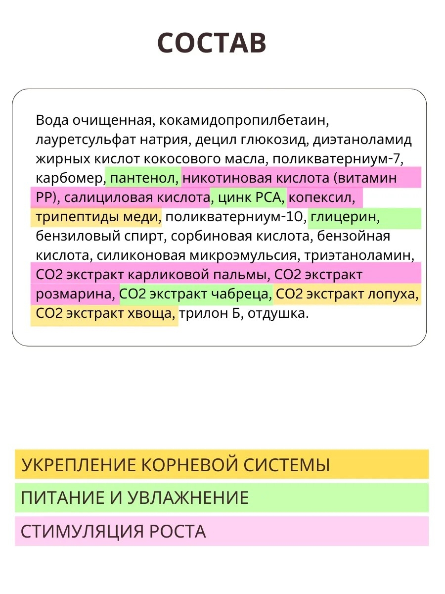 Вода очищенная, кокамидопропилбетаин, лауретсульфат натрия, децил глюкозид, диэтаноламид жирных кислот кокосового масла, поликватерниум-7, карбомер, пантенол, никотиновая кислота (витамин РР), салициловая кислота, цинк РСА, копексил, трипептиды меди, поликватерниум-10, глицерин, бензиловый спирт, сорбиновая кислота, бензойная кислота, силиконовая микроэмульсия, триэтаноламин, СО2 экстракт карликовой пальмы, СО2 экстракт розмарина, СО2 экстракт чабреца, СО2 экстракт лопуха, СО2 экстракт хвоща, трилон Б, отдушка.