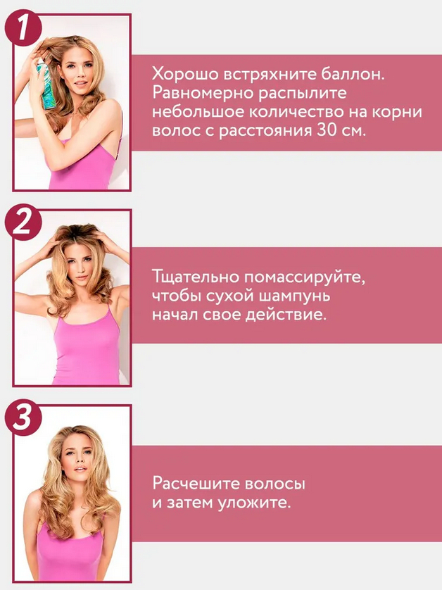 Чтобы волосы выглядели "как после душа", нужно распылить с расстояния 30 см на корни, далее подождать три минуты, затем помассировать голову у и тщательно расчесать волосы. Если же вы просто хотите освежить укладку, которую нельзя расчёсывать, то после использования можно сдуть остатки шампуня феном в режиме холодного ветерка.Мы используем файлы cookie для обеспечения удобства работы с сайтом и его контакта с пользователем.