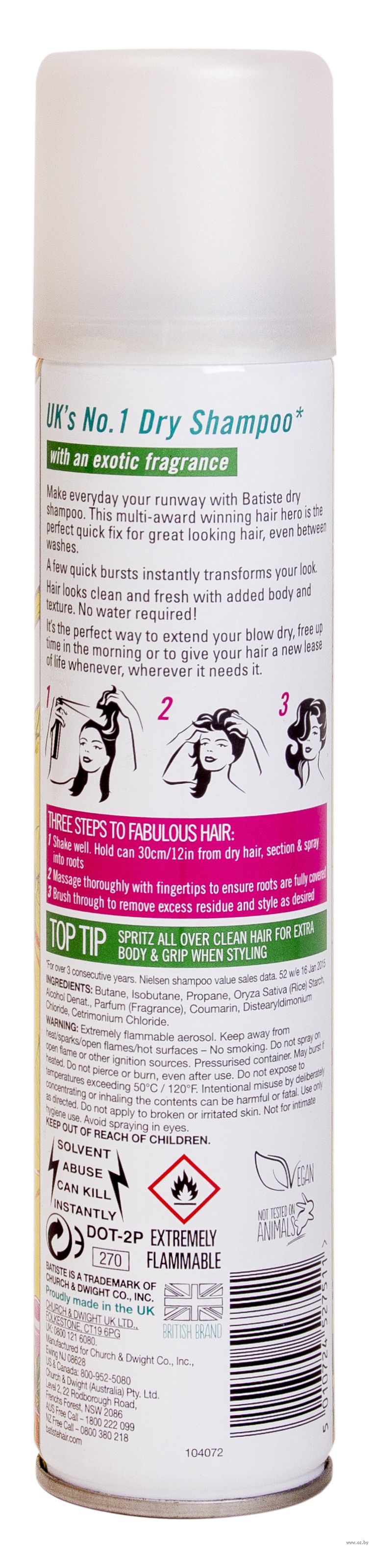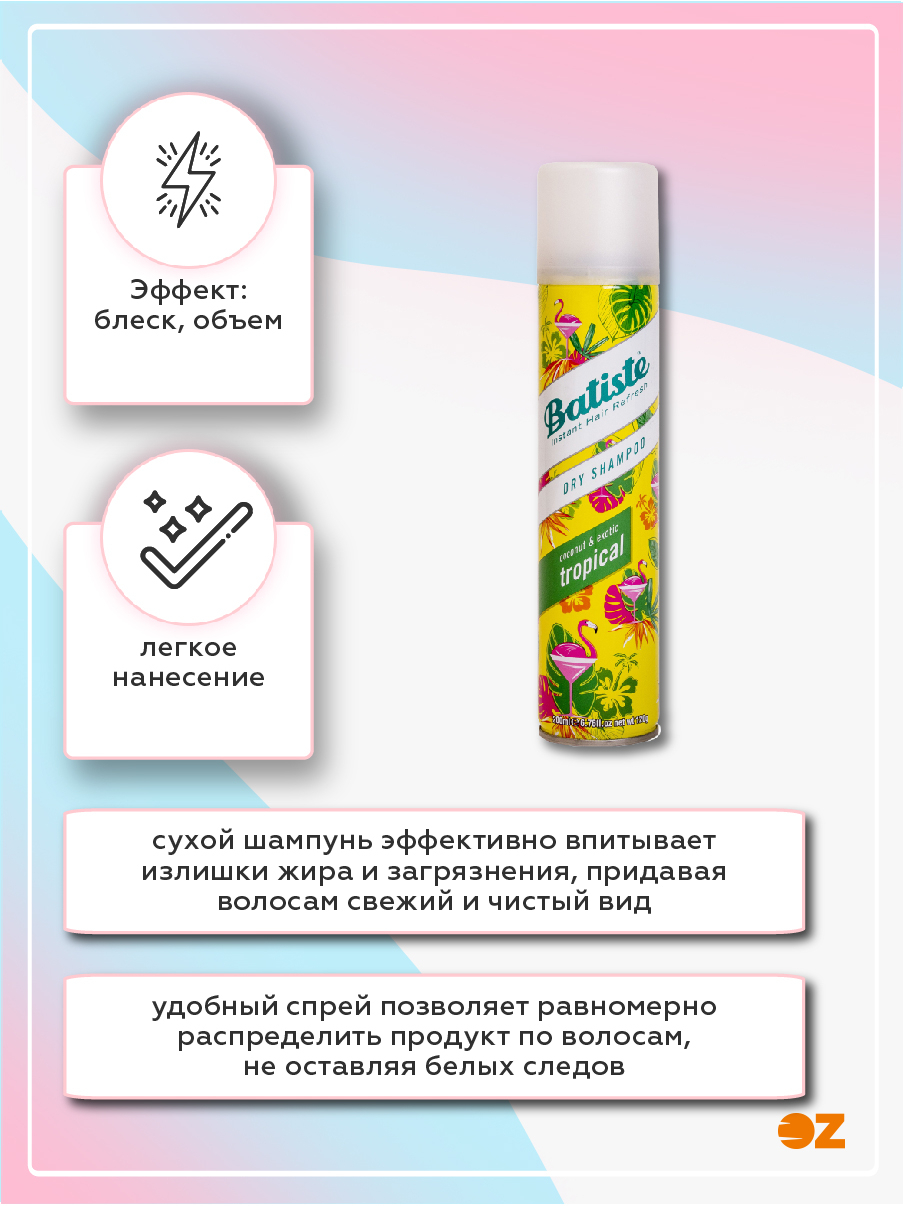 "Tropical" – сухой шампунь с ароматом пляжной экзотики и фруктов, предназначенный для быстрого придания волосам свежести, объема и структурности. Его действие такое же, как и у оригинального шампуня, но сочетание ноток парфюма достаточно тонкое и необычное: дыня, банан, кокос, слива, персик, ваниль и сандал.
