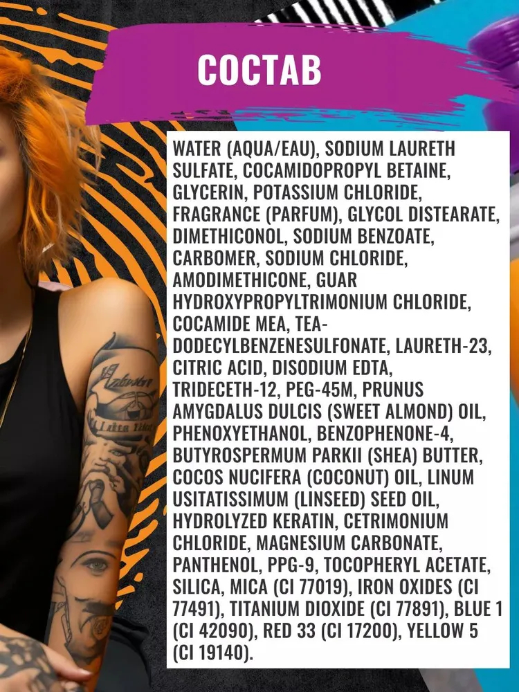 Water (Aqua/Eau), Sodium Laureth Sulfate, Cocamidopropyl Betaine, Glycerin, Potassium Chloride, Fragrance (Parfum), Glycol Distearate, Dimethiconol, Cocos Nucifera (Coconut) Oil, Linum Usitatissimum (Linseed) Seed Oil, Glycine Soja (Soybean) Oil, Phenoxyethanol, Carbomer, Sodium Chloride, Amodimethicone, Hydrolyzed Keratin, Prunus Amygdalus Dulcis (Sweet Almond) Oil, Butyrospermum Parkii (Shea) Butter, Guar Hydroxypropyltrimonium Chloride, TEA-Dodecylbenzenesulfonate, Laureth-23, Citric Acid, Trideceth-12, Disodium EDTA, Sodium Benzoate, PEG-45M, Magnesium Nitrate, Benzophenone-4, Magnesium Carbonate, Cetrimonium Chloride, Panthenol, PPG-9, Tocopheryl Acetate, Silica, Methylchloroisothiazolinone, Magnesium Chloride, Methylisothiazolinone, Mica (CI 77019), Titanium Dioxide (CI 77891), Iron Oxides (CI 77491), Blue 1 (CI 42090), Red 33 (CI 17200), Yellow 5 (CI 19140).