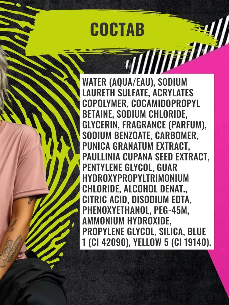 Water (aqua/eau), sodium laureth sulfate, acrylates copolymer, cocamidopropyl betaine, sodium chloride, glycerin, fragrance (parfum), sodium benzoate, carbomer, punica granatum extract, paullinia cupana seed extract, pentylene glycol, guar hydroxypropyltrimonium chloride, alcohol denat., citric acid, disodium edta, phenoxyethanol, peg-45m, ammonium hydroxide, propylene glycol, silica, blue 1 (ci 42090), yellow 5 (ci 19140).