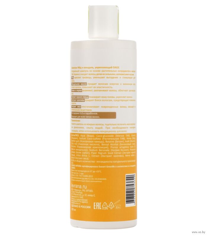 Аqua (вода), coco-glucoside (мягкое пав), glycerin (глицерин), sodium coco-sulfate (растительное пав), honey (мёд), xanthan gum (ксантановая камедь), betaine (бетаин), inulin (инулин), citric acid (лимонная кислота), benzyl alcohol (бензиловый спирт), perfume (парфюмерная композиция), prunus amygdalus dulcis oil (масло миндальное), sodium benzoate (натрия бензоат), potassium sorbate (калия сорбат), piper nigrum seed extract (экстракт черного перца), urtica dioica l. extract (экстракт крапивы), avena sativa l. extract (экстракт овса).