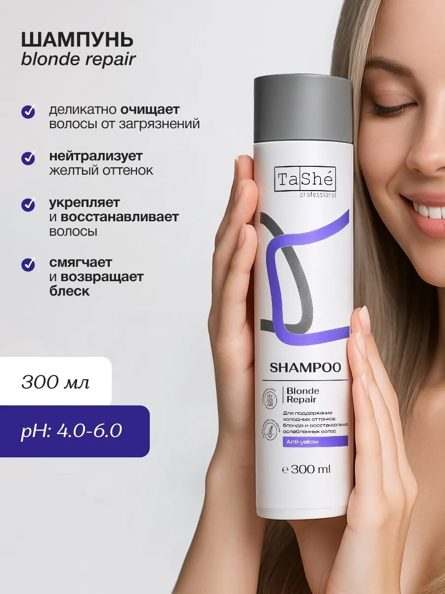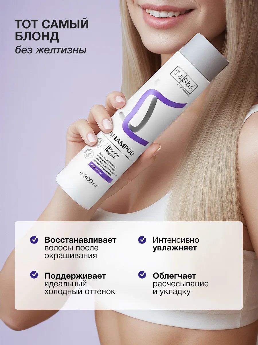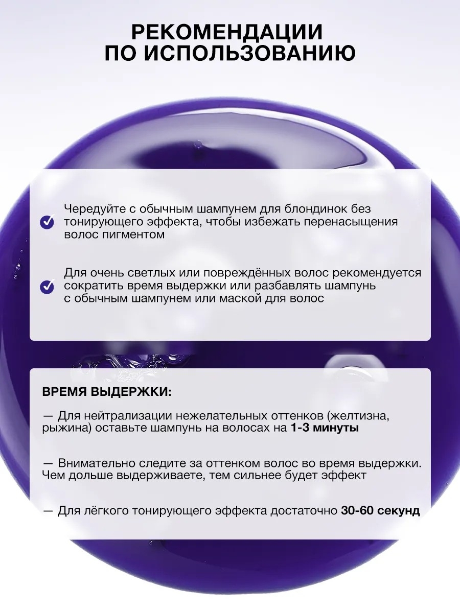 Шампунь мягко и бережно очищает волосы, нейтрализуя нежелательный желтый оттенок.