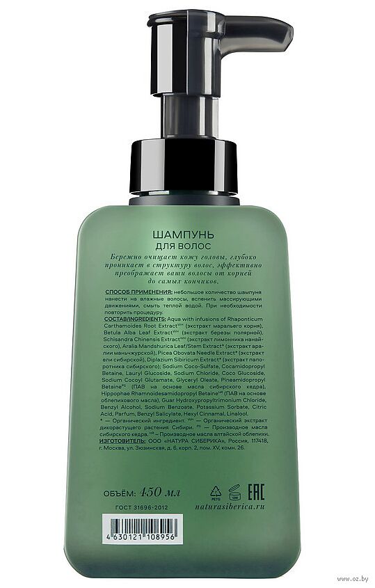 Aqua with infusions of Abies Sachalinensis Needle ExtractWH (экстракт пихты сахалинской), Poa Аrctica Flower Leaf Stem ExtractWH (экстракт мятлика арктического), Hesperis Sibirica Flower Leaf Stem ExtractWH (экстракт вечерницы сибирской), Rhaponticum Carthamoides Root ExtractWH (экстракт маральего корня), Betula Alba Leaf ExtractWH (экстракт березы полярной), Schisandra Chinensis ExtractWH (экстракт лимонника нанайского), Salvia Officinalis Leaf Extract* (экстракт шалфея лекарственного), Silybum Marianum Extract* (экстракт расторопши пятнистой), Aralia Mandshurica Leaf Stem Extract* (экстракт аралии маньчжурской), Picea Obovata Needle Extract* (экстракт ели сибирской), Diplazium Sibiricum Extract* (экстракт папоротника сибирского); Sodium Coco-Sulfate, Cocamidopropyl Betaine, Lauryl Glucoside, Glycerin, Pineamidopropyl BetainePS (ПАВ на основе масла сибирского кедра), Hippophae Rhamnoidesamidopropyl BetaineHR (ПАВ на основе облепихового масла), Sodium Chloride, Guar Hydroxypropyltrimonium Chloride, Benzyl Alcohol, Sodium Benzoate, Potassium Sorbate, Parfum, Benzyl Salicylate, Coumarin, Hydroxycitronellal, Linalool, Citric Acid.