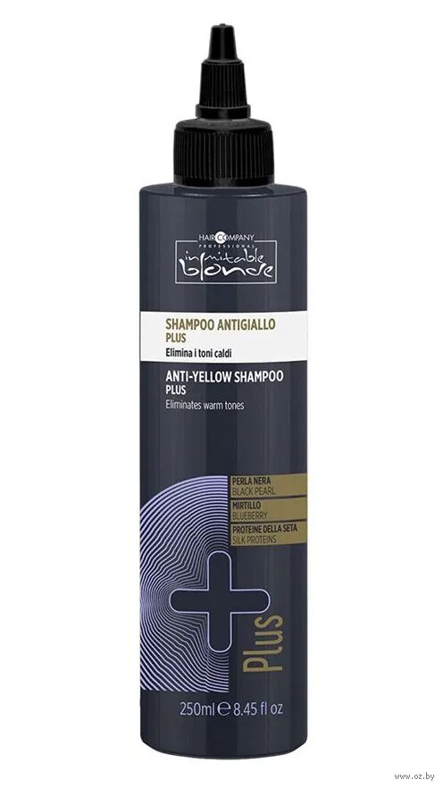 Инновационный черный шампунь, богатый нейтрализующими веществами, которые убирают желтые и оранжевые оттенки волос. Создан для сохранения холодного блонда и для седых волос.