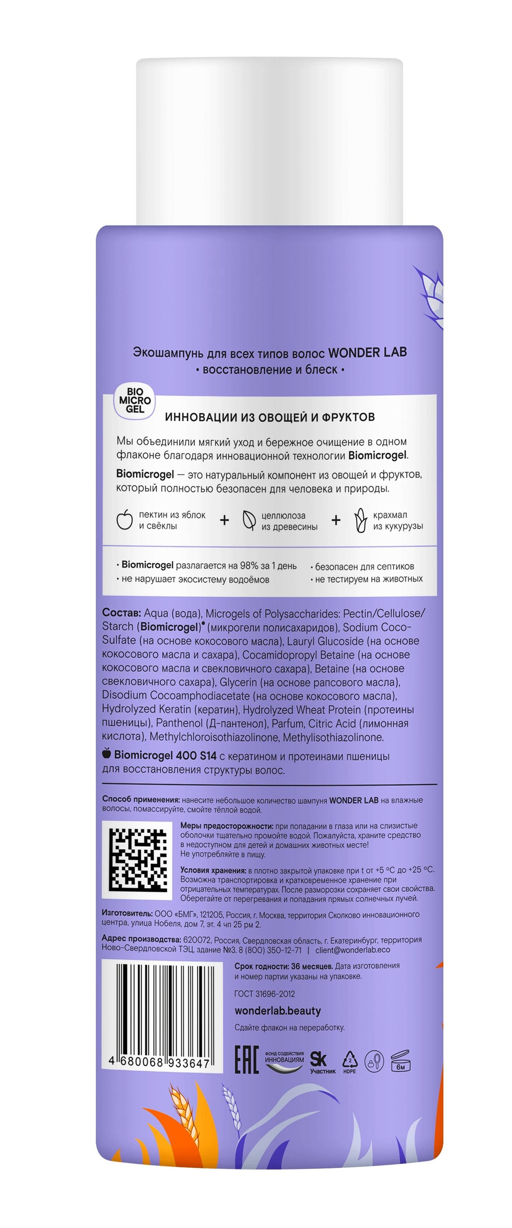 Aqua (вода), Microgels of Polysaccharides: Pectin/Cellulose/Starch (Biomicrogel) (микрогели полисахаридов), Sodium Coco-Sulfate (на основе кокосового масла), Lauryl Glucoside (на основе кокосового масла и сахара), Cocamidopropyl Betaine (на основе кокосового масла и свекловичного сахара), Betaine (на основе свекловичного сахара), Glycerin (на основе рапсового масла), Disodium Cocoamphodiacetate (на основе кокосового масла), Hydrolyzed Keratin (кератин), Hydrolyzed Wheat Protein (протеины пшеницы), Panthenol (Д-пантенол), Parfum, Citric Acid (лимонная кислота), Methylchloroisothiazolinone, Methylisothiazolinone.Мы используем файлы cookie для обеспечения удобства работы с сайтом и его контакта с пользователем.