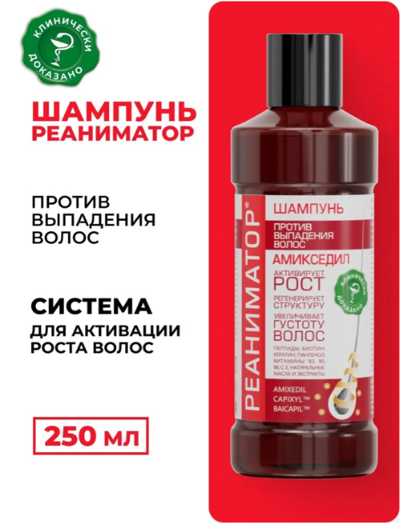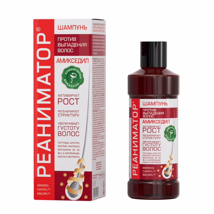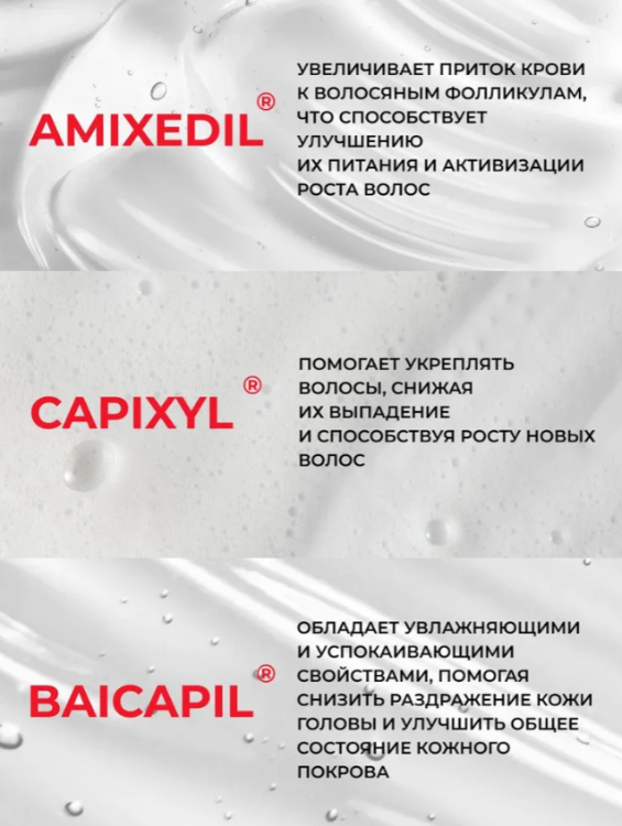 Содержит 3 мощных активатора роста волос Amixedil, Capixyl, Baicapil, комплекс растительных экстрактов и витаминов В, Е, С. Увеличивает густоту и плотность волос. Справляется с проблемой выпадения.