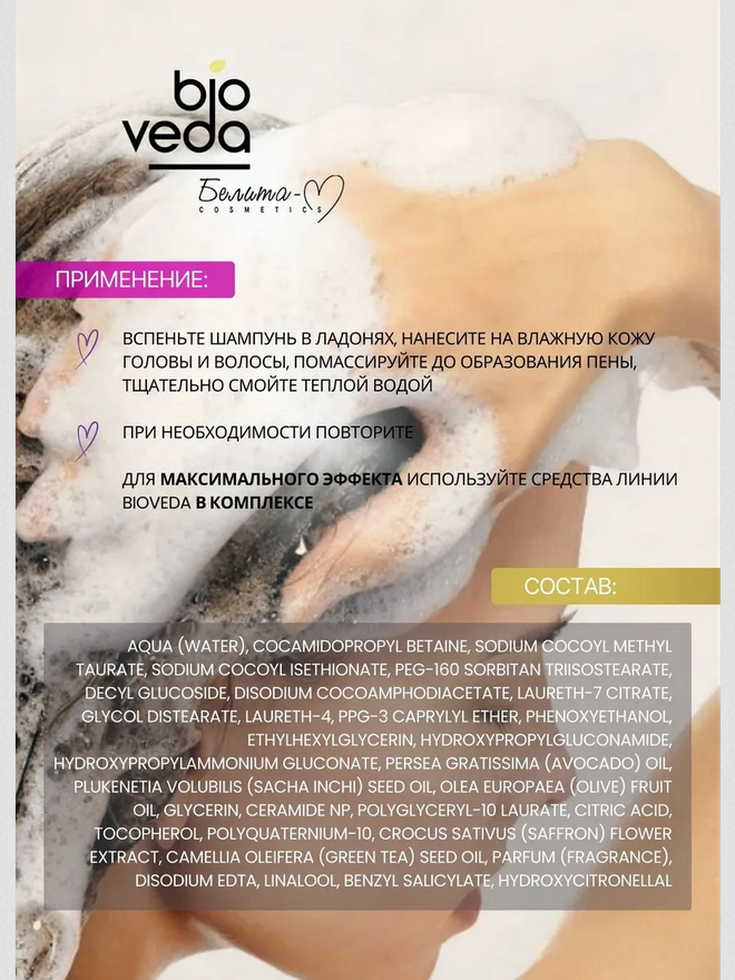 Вспеньте в ладонях, нанесите на влажную кожу головы и волосы, помассируйте до образования пены, тщательно смойте теплой водой. При необходимости повторите.Состав