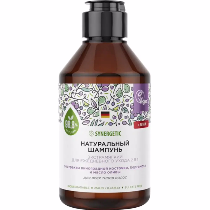 Бессульфатный шампунь Synergetic "Экстрамягкий" – эффективное средство для очищения кожи головы и всех типов волос – более чем на 98% состоит из натуральных компонентов. Шампунь деликатно очищает, эффективно ухаживает за волосами и защищает кожу головы. Формула с бетаином восстанавливает поврежденные волосы, укрепляет и стимулирует их рост.Натуральный шампунь содержит комплекс масел миндаля и оливы, который восстанавливает волосы, придает им мягкость и эластичность.