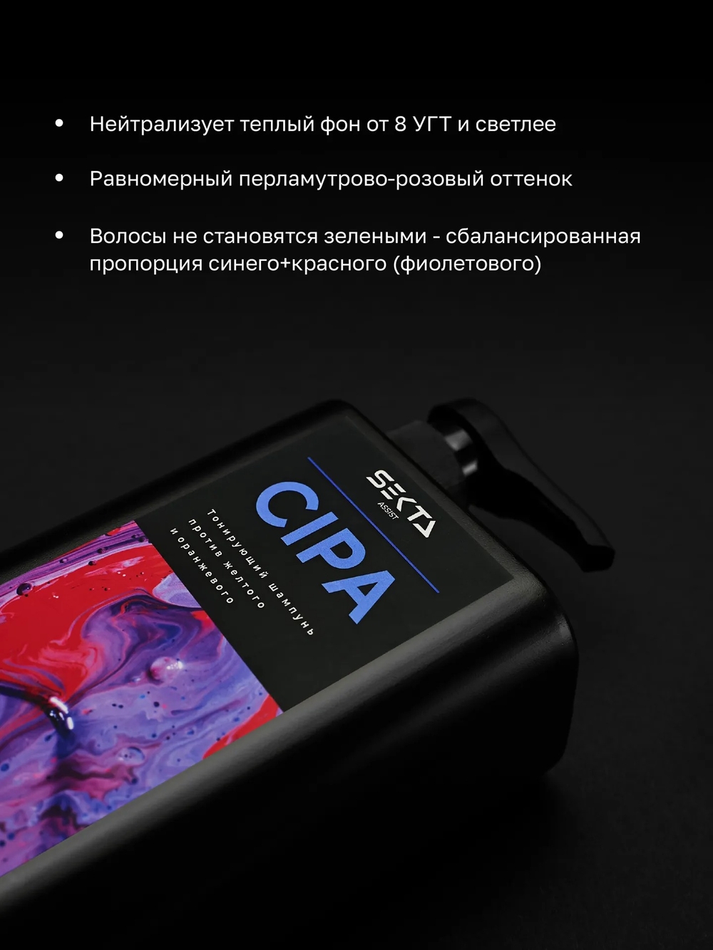 Предназначен для осветлённых волос. Интенсивно и глубоко очищает волосы от загрязнений, эффективно удаляет последствия использования продуктов стайлинга, придаёт оттенок волосам. Продукт нейтрализует все тёплые (жёлтый и оранжевый) оттенки на волосах и усиливает тонирующий эффект. Чем чище ваши волосы были осветлены, тем чище будет результат после CIPA. Создано действующими и востребованными профессионалами.