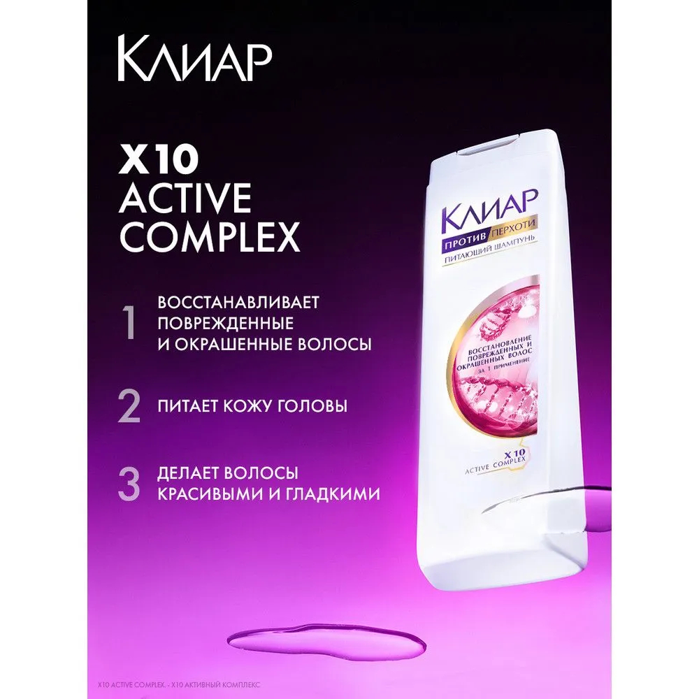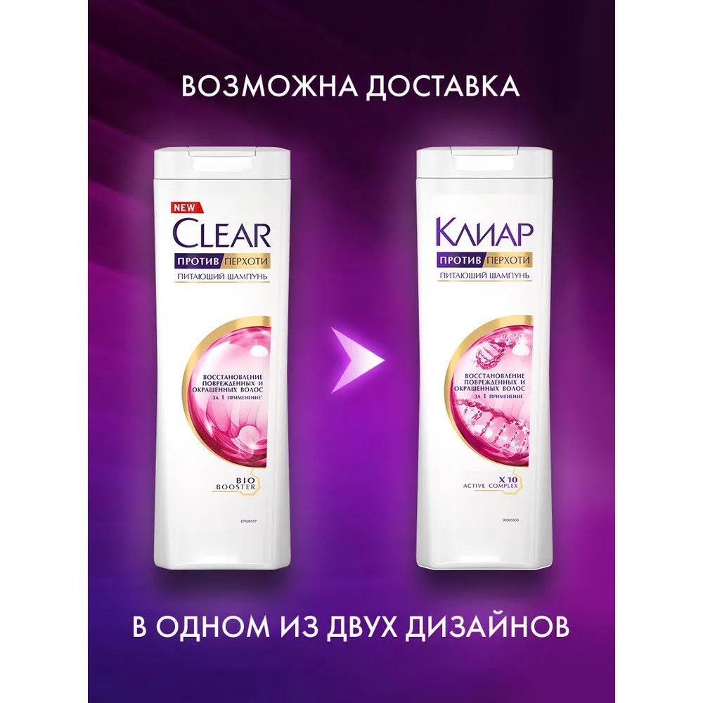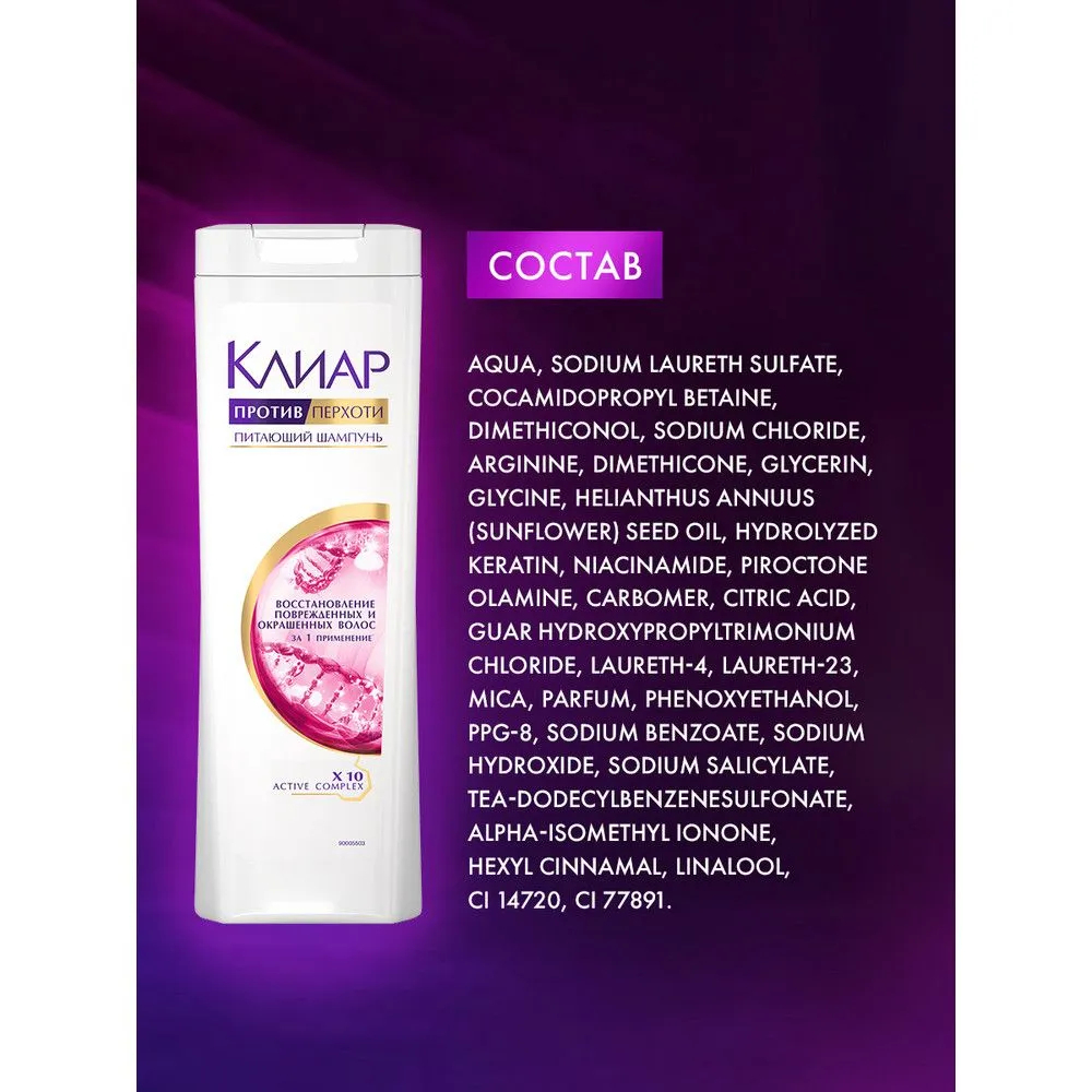 Женский шампунь против перхоти Clear Восстановление поврежденных и окрашенных волос создан с учетом особенностей женской кожи головы: регулярные окрашивания и смена имиджа сушат кожу, способствуя появлению перхоти, истончению, хрупкости и ломкости волос. Шампунь Clear Восстановление поврежденных и окрашенных волос обладает комплексным действием: очищает, питает и увлажняет, избавляет от перхоти и эффективно восстанавливает волосы, возвращая им утраченную силу, блеск и гладкость.