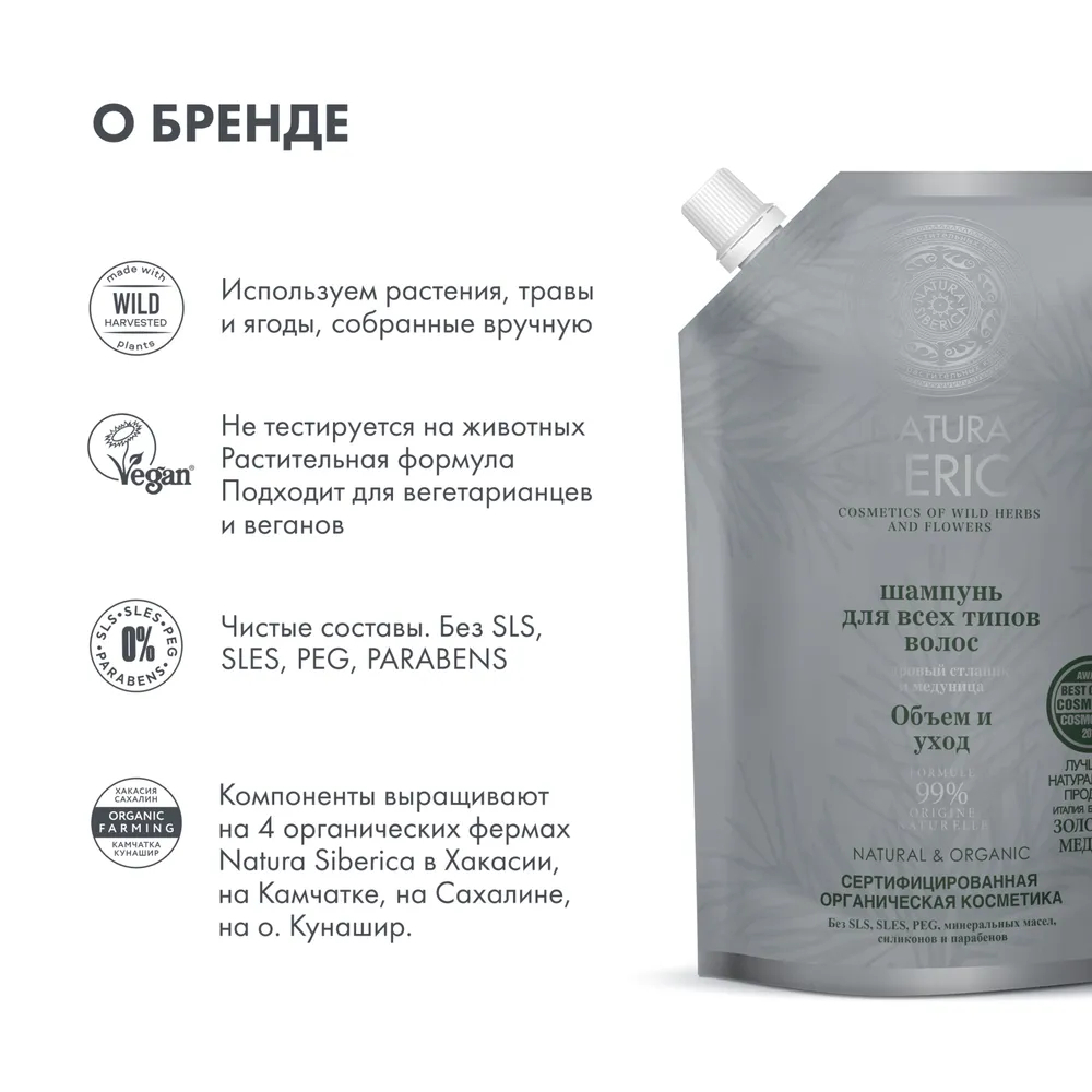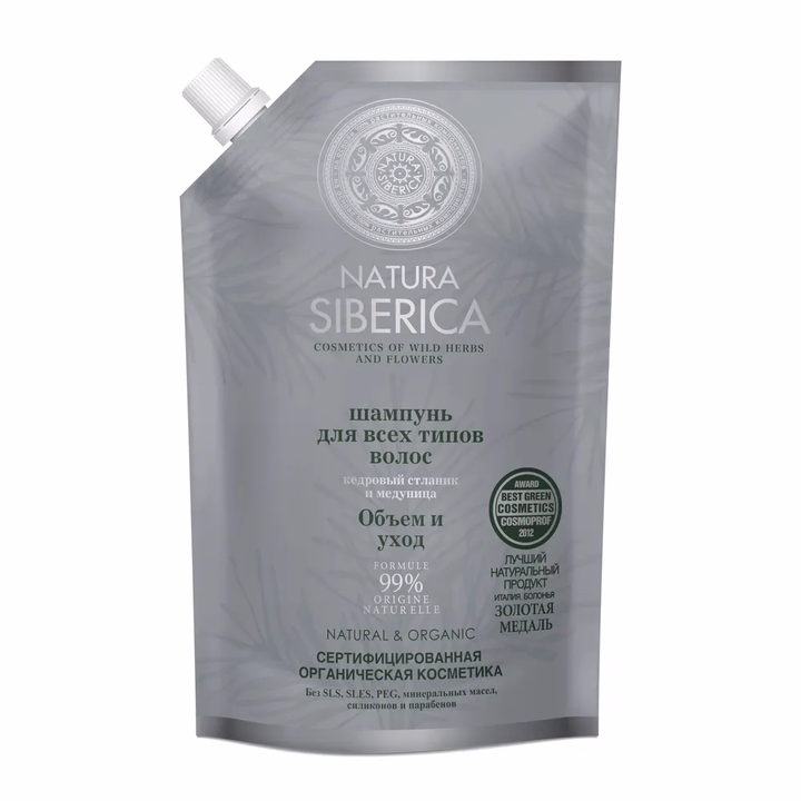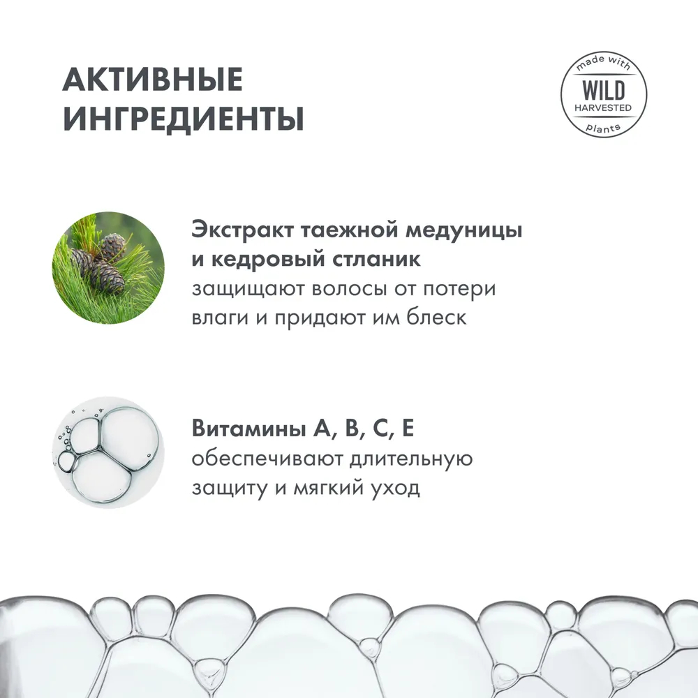 Входящий в состав экстракт таежной медуницы (Pulmonaria Officinalis) прекрасно дополняет кедровый стланик, защищая волосы от потери влаги и придавая им сияющий блеск, а содержащиеся в медунице четыре витамина А, В, С, Е обеспечивают длительную защиту и мягкий уход.