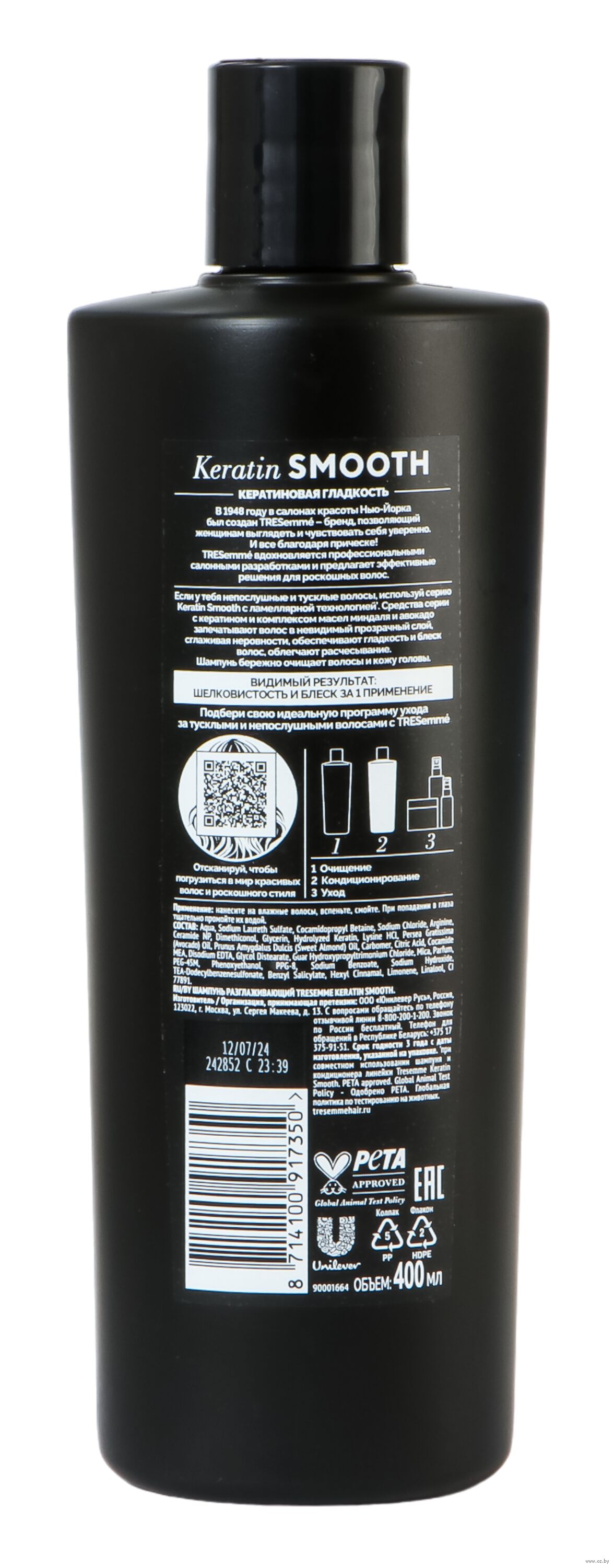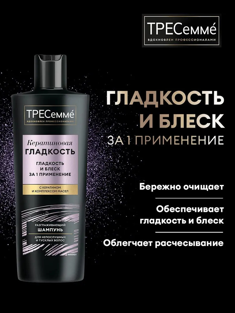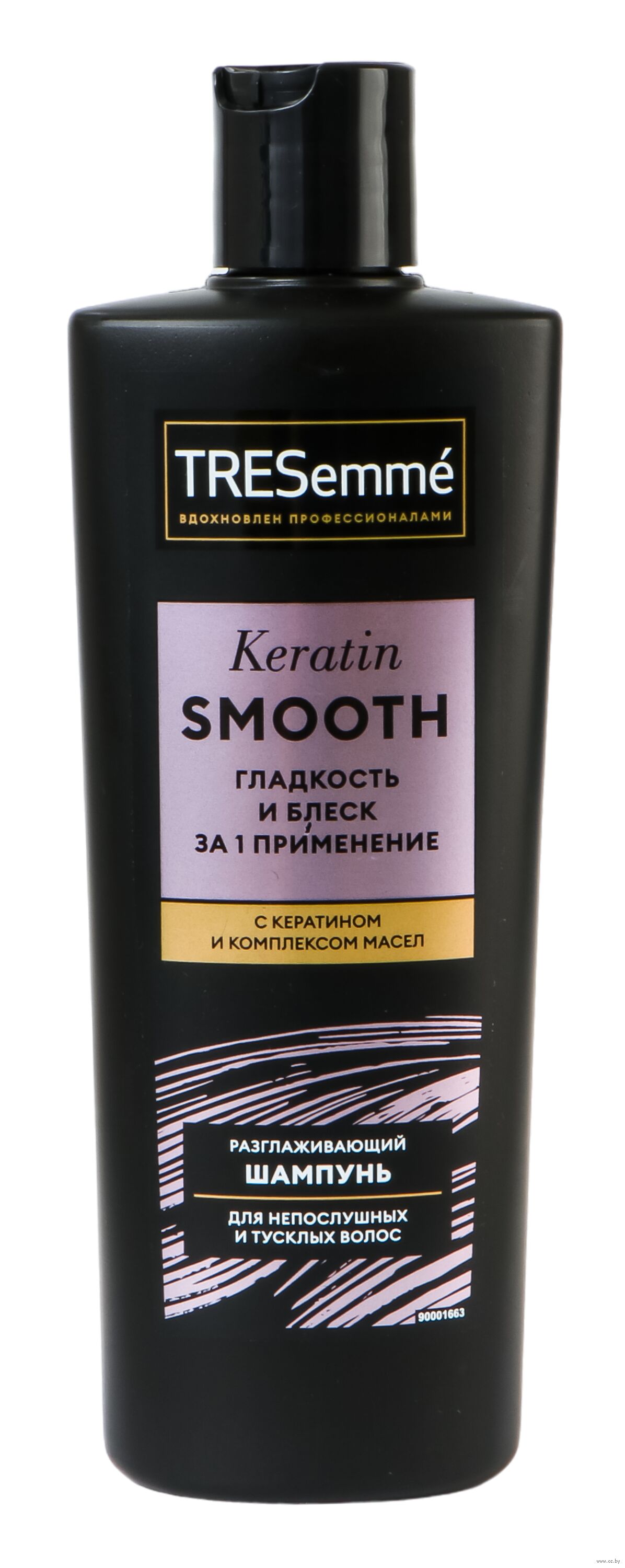 Шампунь "Tresemme Keratin Smooth": формула с кератином и маслом марулы запечатывает волос в невидимый прозрачный слой, сглаживая любые неровности.