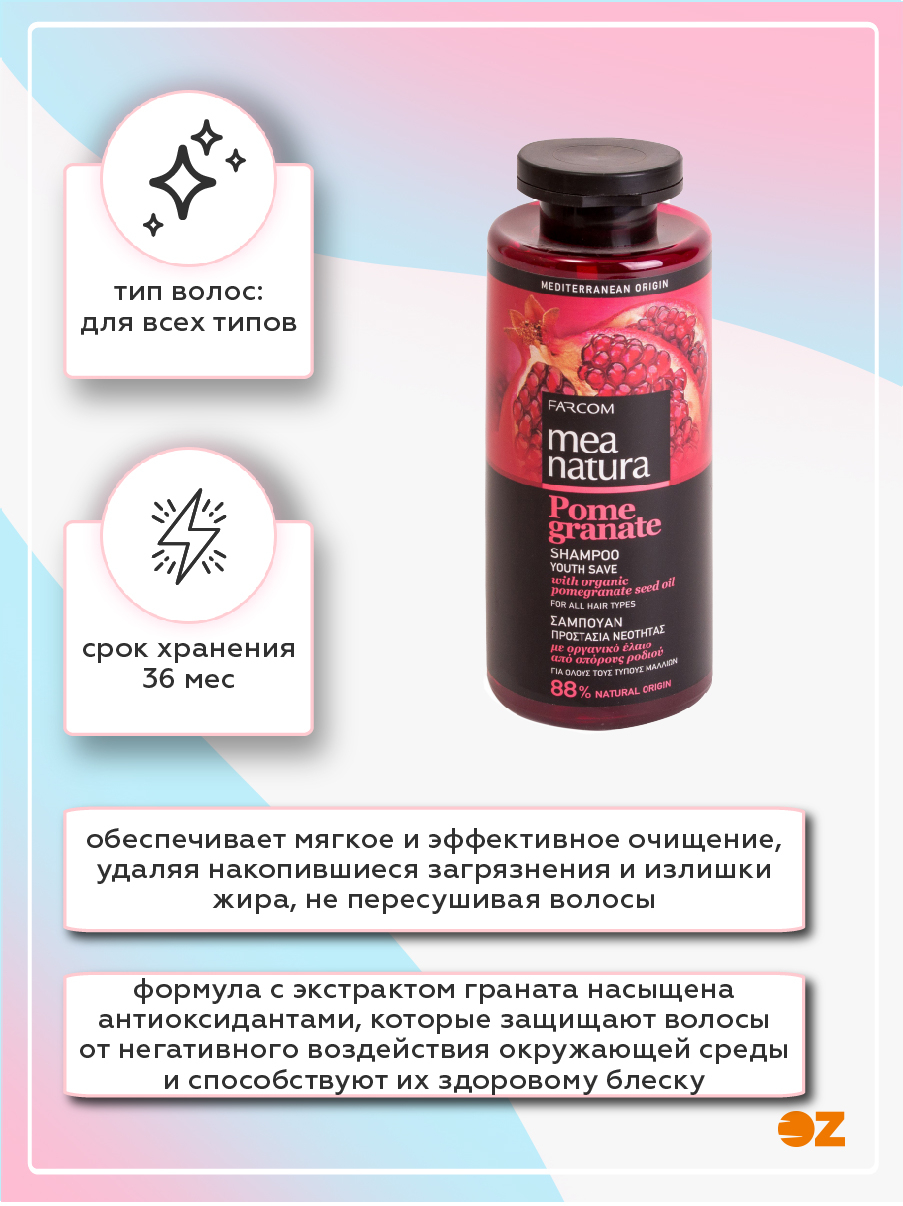 Шампунь для сохранения молодости волос, с органическим маслом гранатовых косточек, полисахаридами и льняным маслом.