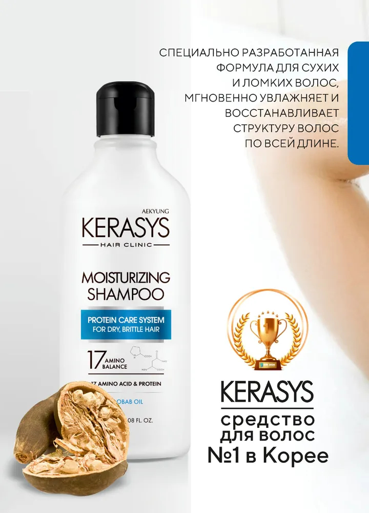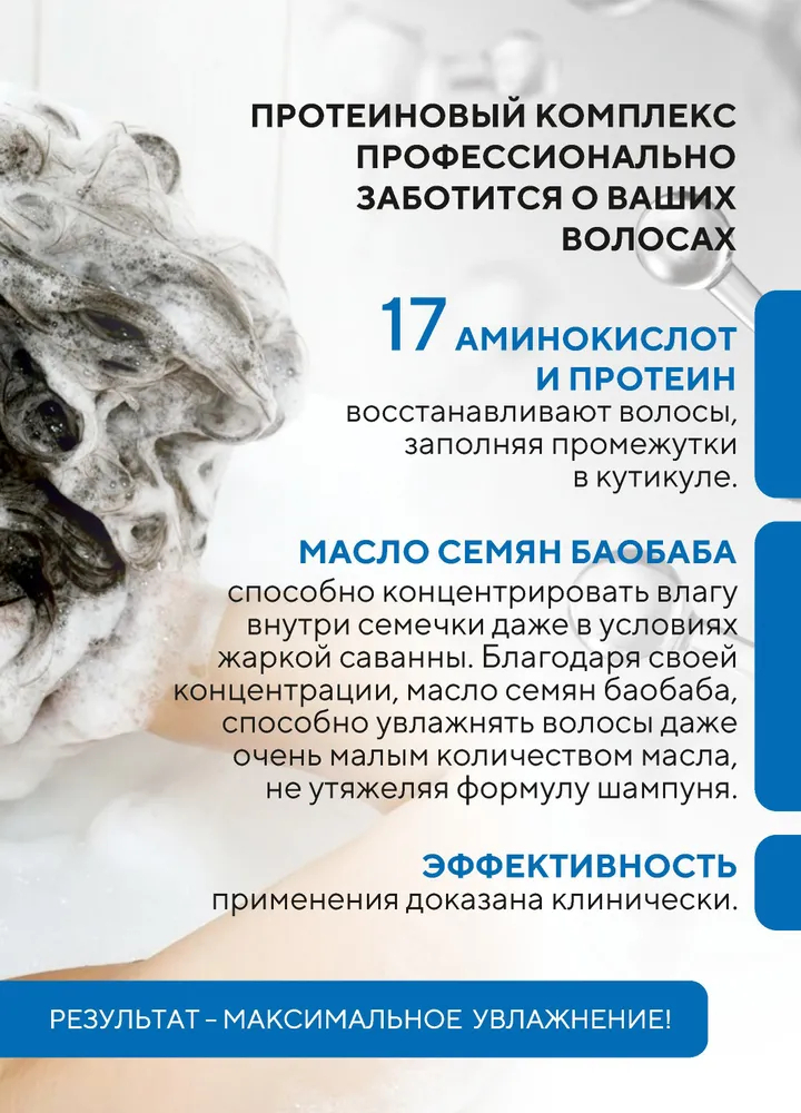 Специально разработанная формула для сухих и ломких волос, мгновенно увлажняет и восстанавливает структуру волос по всей длине.