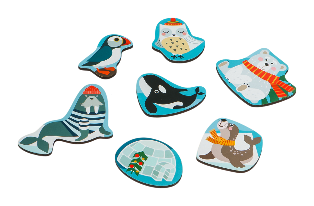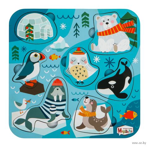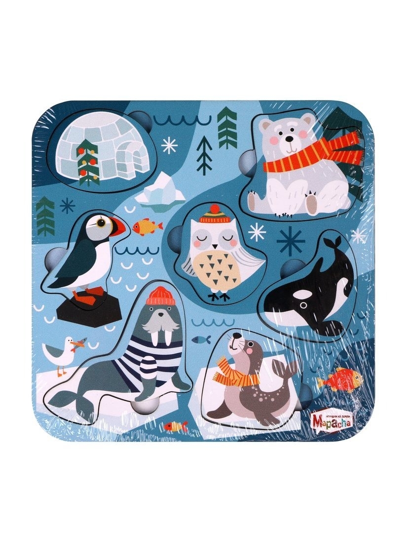 Эти милые вкладыши поспособствуют всестороннему развитию малыша. Комплект игры включает рамку-основание с фигурными углублениями и 7 вкладышей с изображением животных и птиц Арктики.