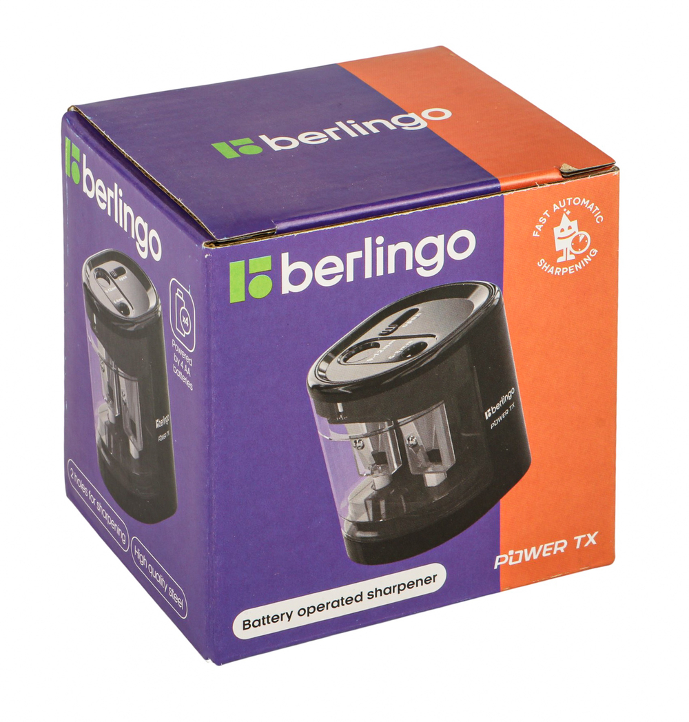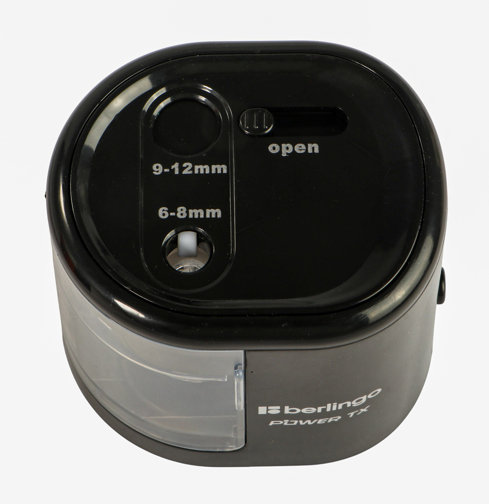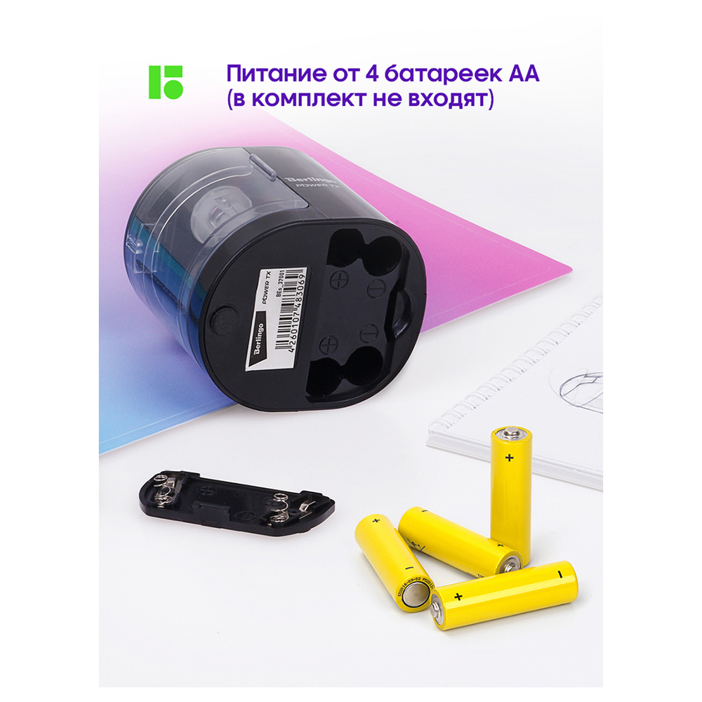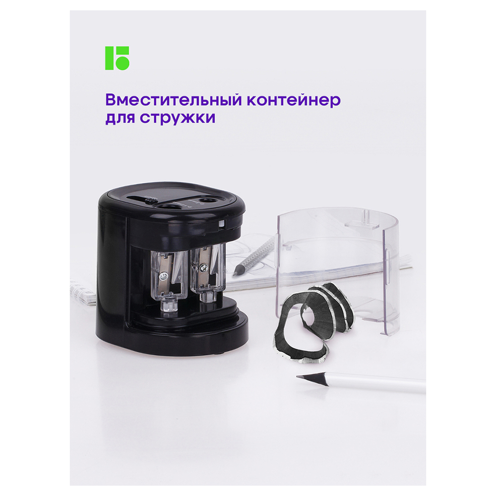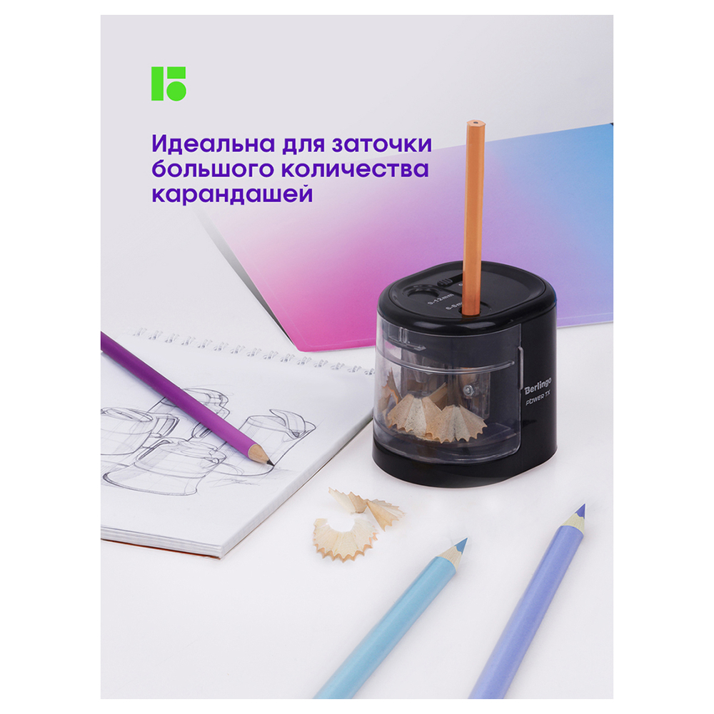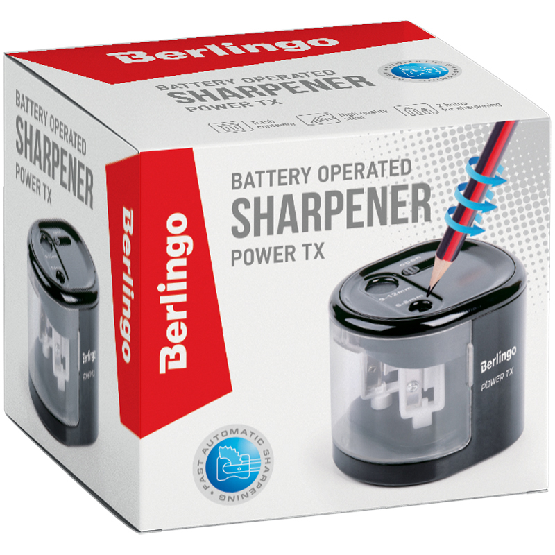 Настольная точилка для чернографитовых и цветных карандашей. Прочный пластиковый корпус. Съёмный контейнер для стружки. Работает на 4 батарейках AA (поставляется без батареек). Может использоваться для ручной заточки.