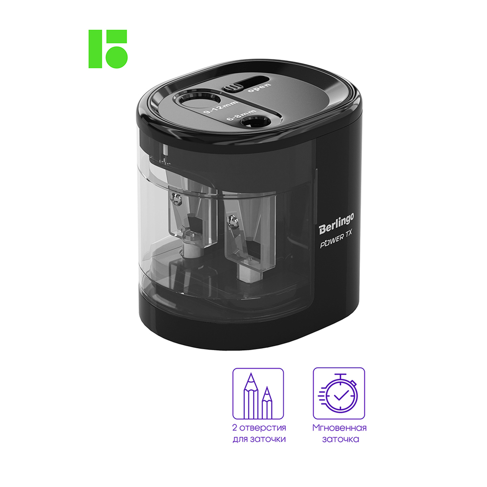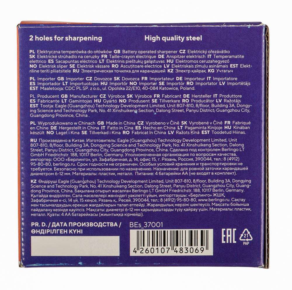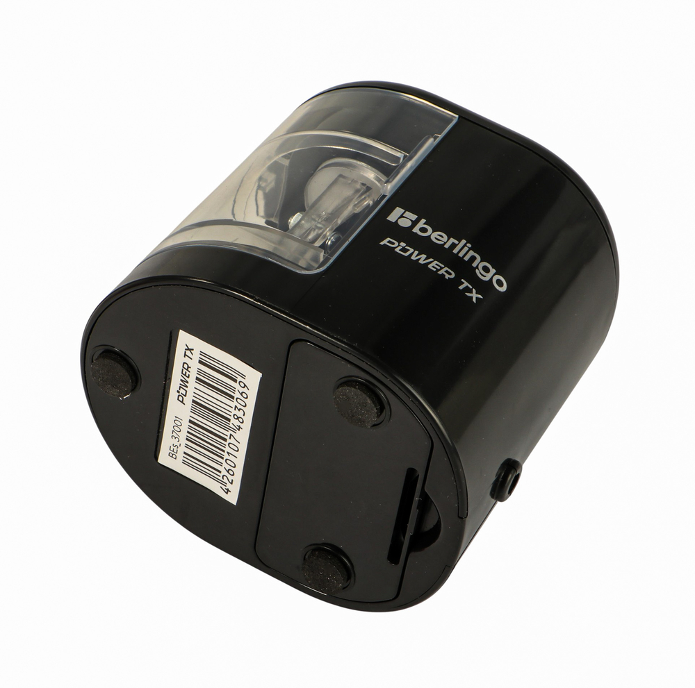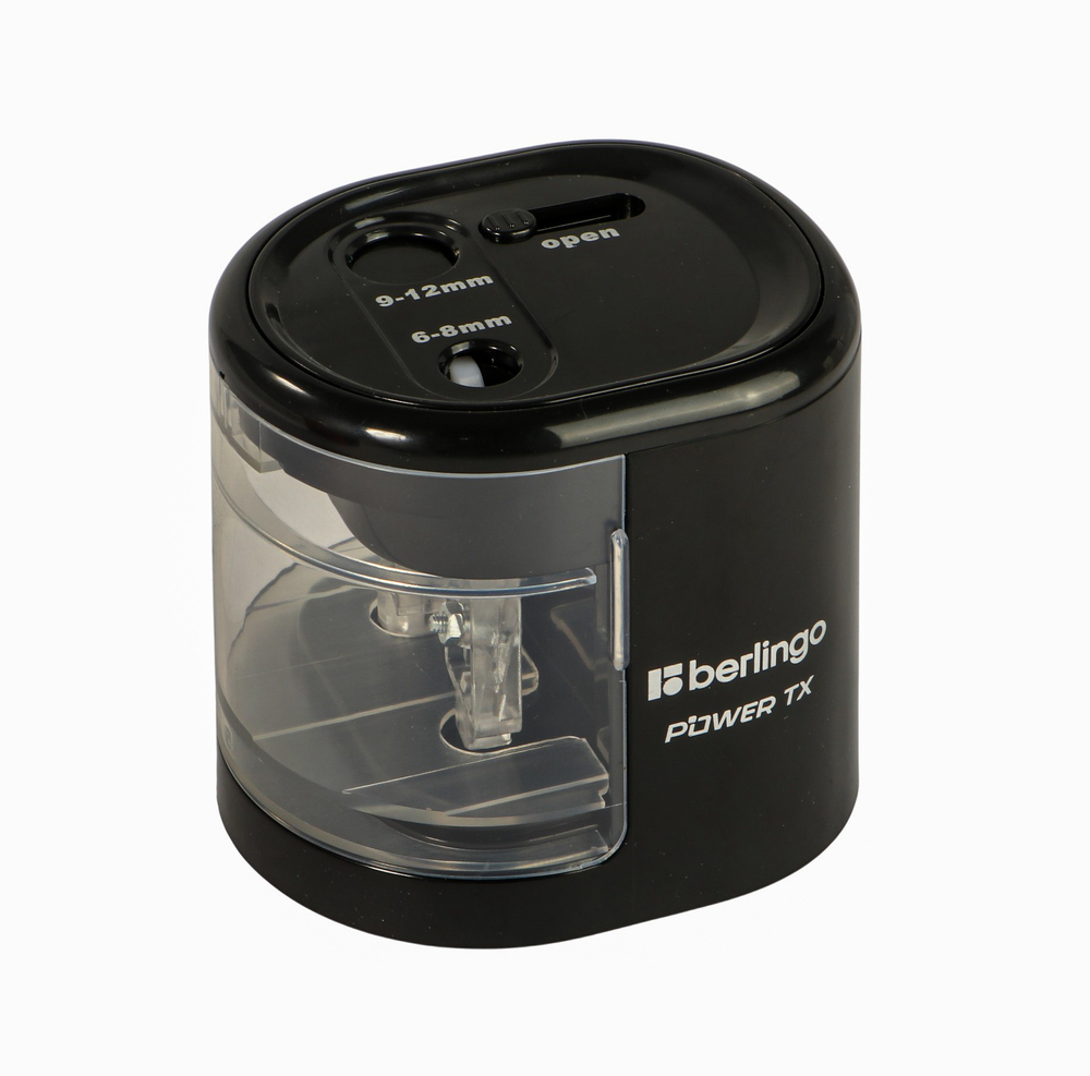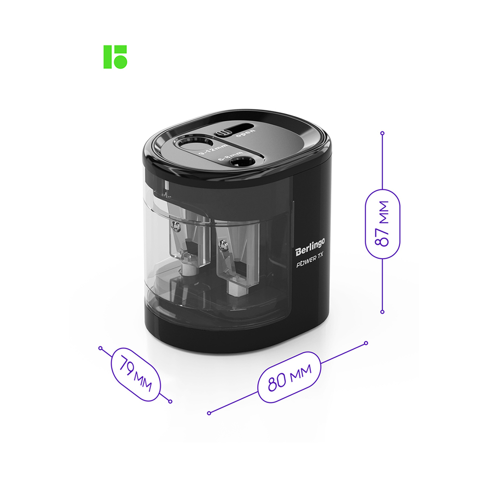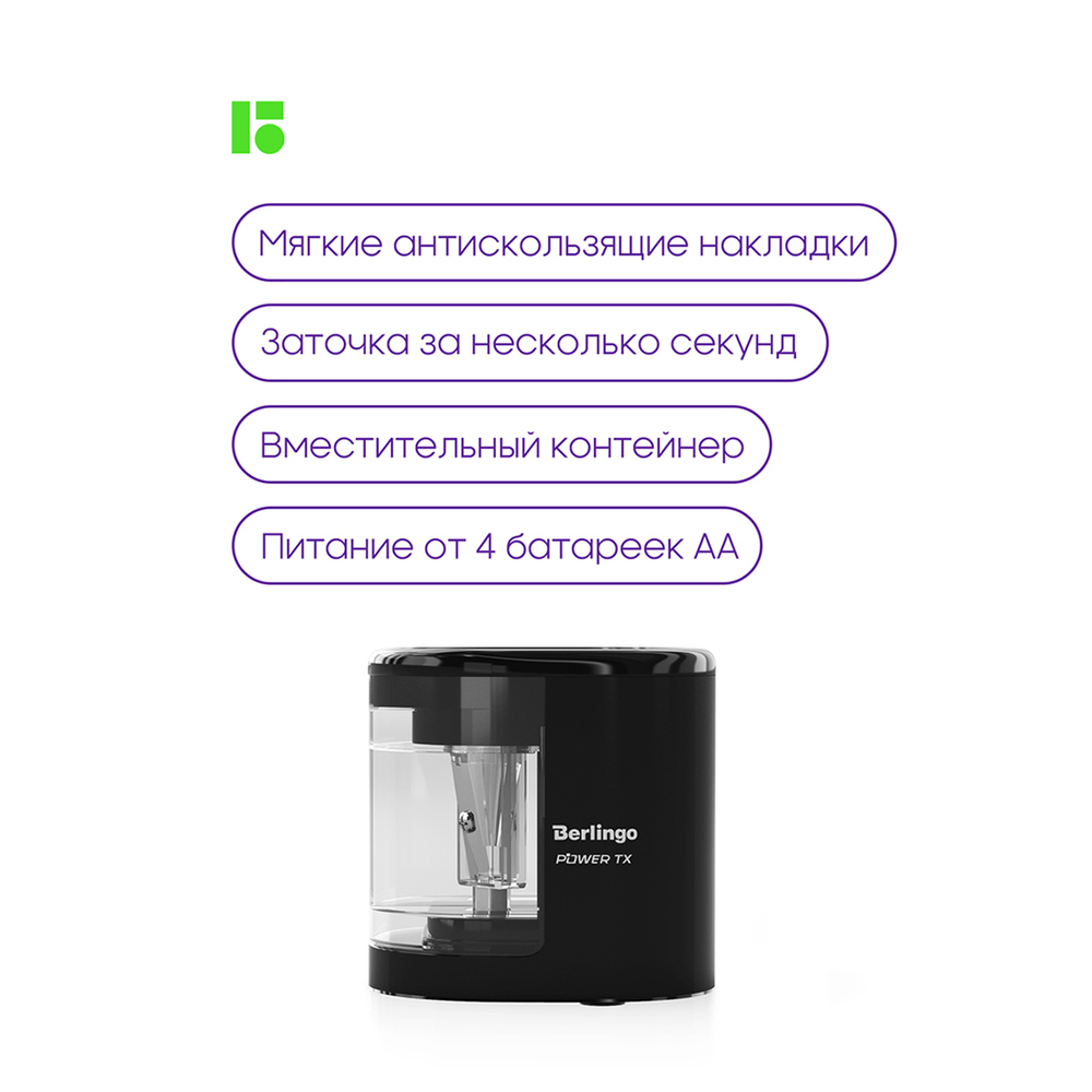 Настольная точилка для чернографитовых и цветных карандашей. Прочный пластиковый корпус. Съёмный контейнер для стружки. Работает на 4 батарейках AA (поставляется без батареек). Может использоваться для ручной заточки.