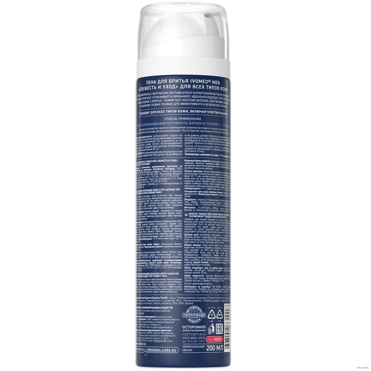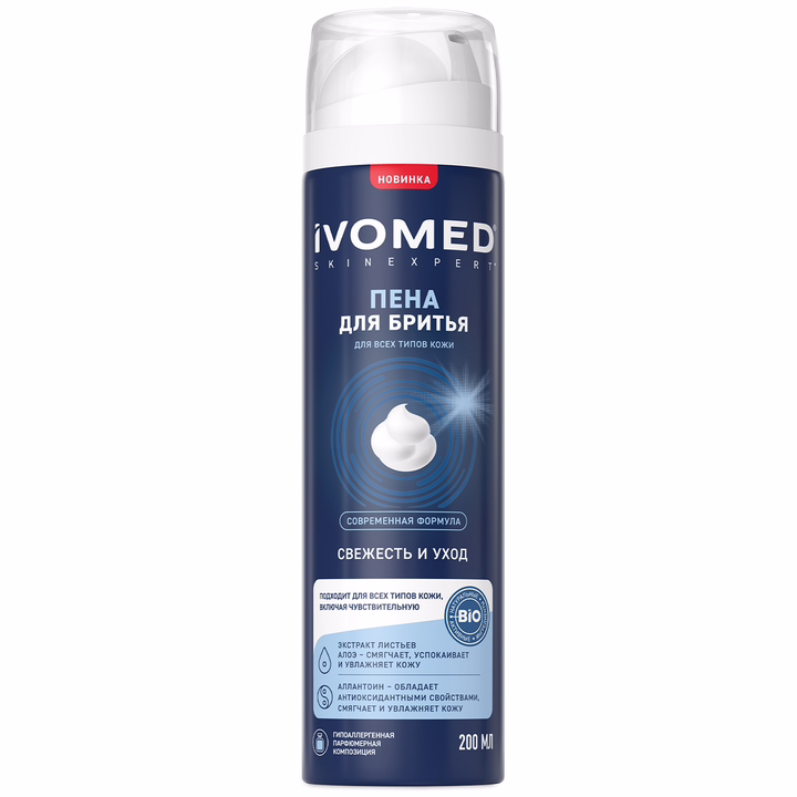 Мягкая формула Пены для бритья IVOMED MEN с экстрактом листьев алоэ и аллантоином бережно ухаживает за кожей, смягчает, успокаивает и увлажняет.