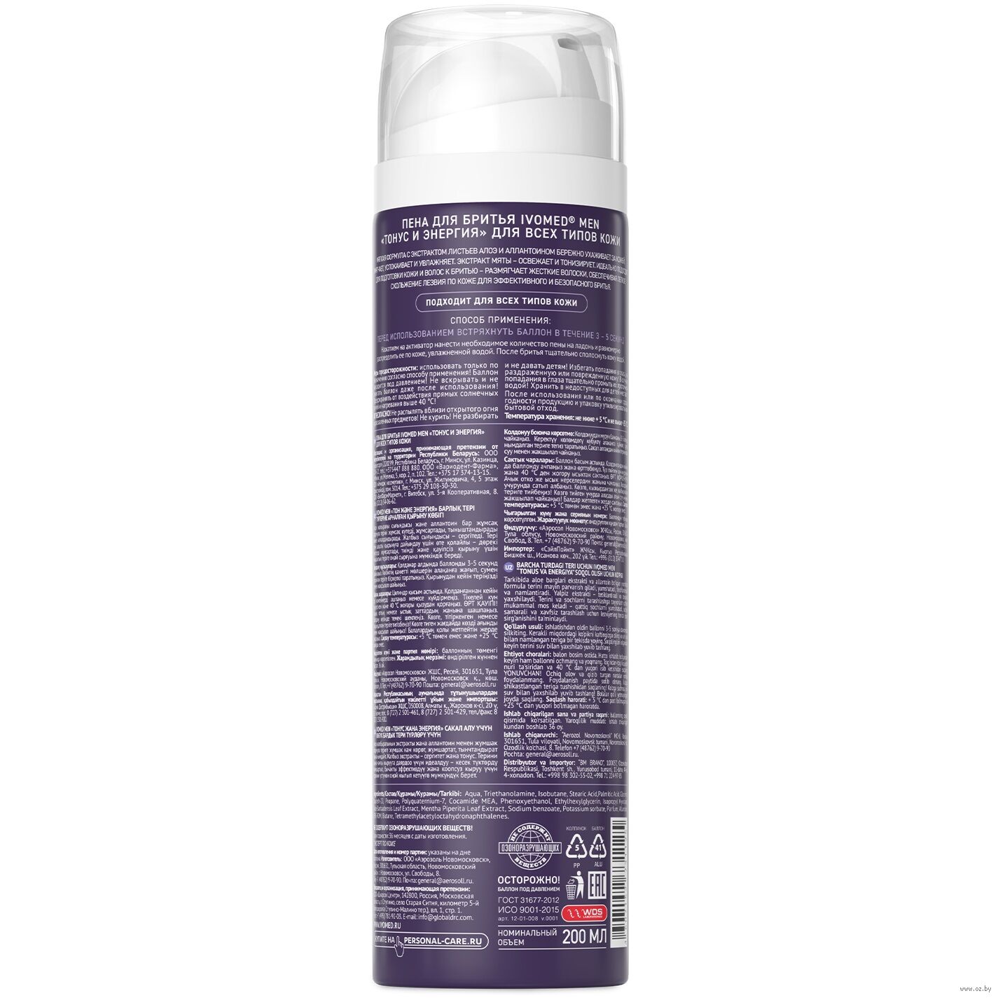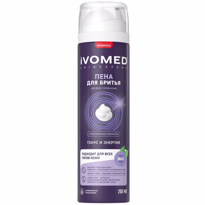 Мягкая формула Пены для бритья IVOMED MEN с экстрактом листьев алоэ и аллантоином бережно ухаживает за кожей, смягчает, успокаивает и увлажняет. Экстракт мяты – освежает и тонизирует.