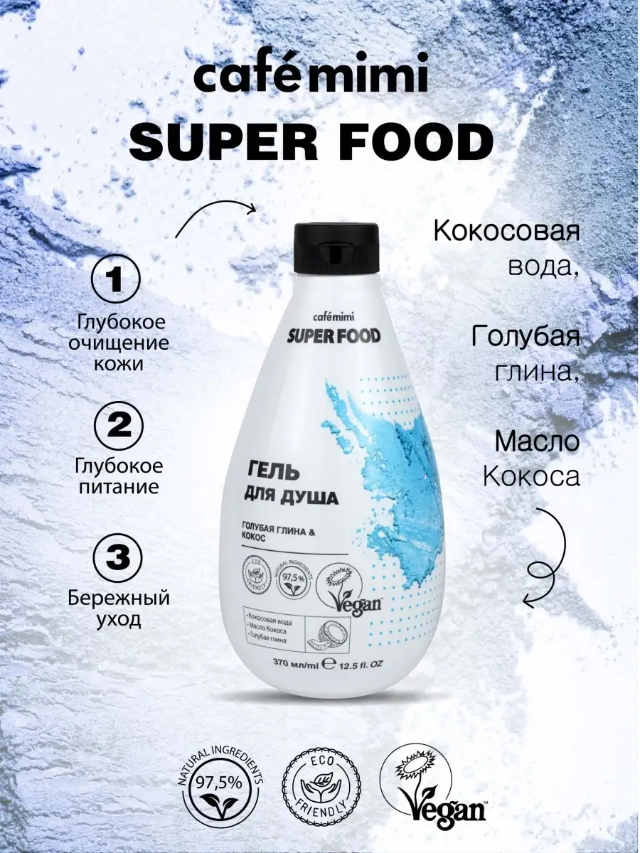 Ароматный гель для душа Cafe Mimi Голубая глина и Кокос серии Super Food создан, чтобы ваша кожа оставалась свежей, обновлённой и чистой. Косметика от Кафе Мими Супер Фуд для ванны и душа дарит прекрасное начало дня или его расслабленное завершение, превосходно очищает кожу, увлажняет и бодрит. Кокос и Голубая глина в этой уходовой косметике для тела мягко отшелушивают омертвевшие клетки кожи, нейтрализуют избыток кислоты эпидермиса и накопление вредных веществ из окружающей среды. Это делает гель для душа идеальной косметикой для чувствительной, сухой, раздраженной, поврежденной и жирной кожи. Гель для душа с глиной обладает уникальной природной формулой, созданной для пробуждения внутреннего и внешнего совершенства кожи – без намёка на агрессивное подсушивание и травмирование. Косметика сочетает в себе все типы ухода: уход за кожей, уход за руками и уход за телом. Благодаря неагрессивному питательному составу может служить как гель для умывания и для интимной гигиены.