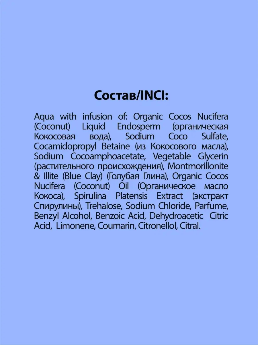 Aqua with infusion of: Organic Cocos Nucifera (Coconut) Liquid Endosperm (органическая Кокосовая вода), Sodium Coco Sulfate, Cocamidopropyl Betaine (из Кокосового масла), Sodium Cocoamphoacetate, Vegetable Glycerin (растительного происхождения), Montmorillonite & Illite (Blue Clay) (Голубая Глина), Organic Cocos Nucifera (Coconut) Oil (Органическое масло Кокоса), Spirulina Platensis Extract (экстракт Спирулины), Trehalose, Sodium Chloride, Parfume, Benzyl Alcohol, Benzoic Acid, Dehydroacetic Acid, Potassium Sorbate, Sodium Benzoate, Citric Acid, Limonene, Coumarin, Citronellol, Citral.