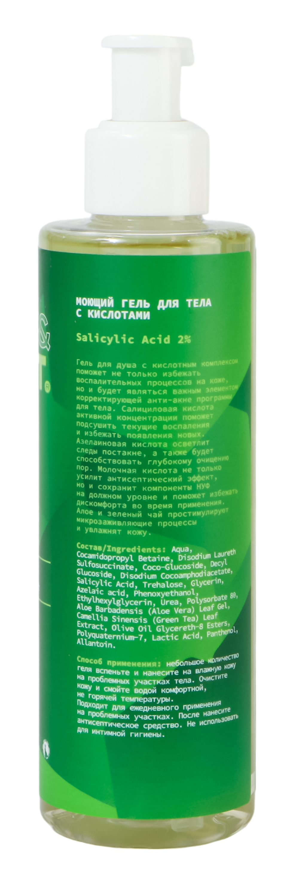 Гель для душа с кислотным комплексом поможет не только избежать воспалительных процессов на коже, но и будет являться важным элементом корректирующей анти-акне программы для тела. Салициловая кислота активной концентрации поможет подсушить текущие воспаления и избежать появления новых. Азелаиновая кислота осветлит следы постакне, а также будет способствовать глубокому очищению пор. Молочная кислота не только усилит антисептический эффект, но и сохранит компоненты НУФ на должном уровне и поможет избежать дискомфорта во время применения. Алое и зеленый чай простимулируют микрозаживляющие процессы и увлажнят кожу.