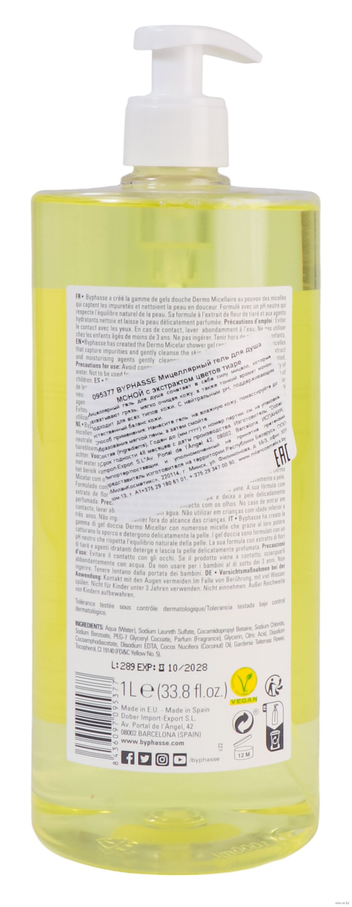 Мицеллярный гель для душа Byphasse Monoi Tahiti изготовлен на основе мягкой формулы без содержания агрессивных компонентов, бережно устраняет загрязнения, глубоко очищает кожу тела, поддерживает оптимальный pH-баланс эпидермиса. Хорошо пенится, экономно расходуется, обладает нежным ароматом.