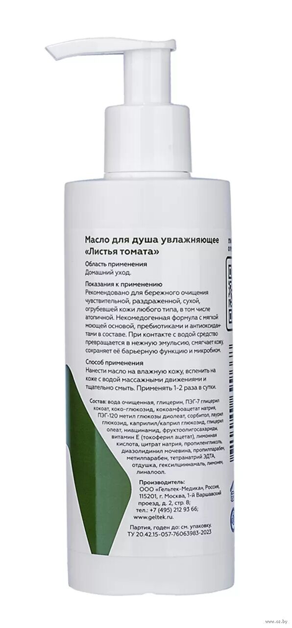 Масло для душа с легким изысканным ароматом с нотками листьев и плодов томата, рекомендовано для бережного очищения чувствительной, раздраженной, сухой, огрубевшей кожи любого типа, в том числе атопичной.