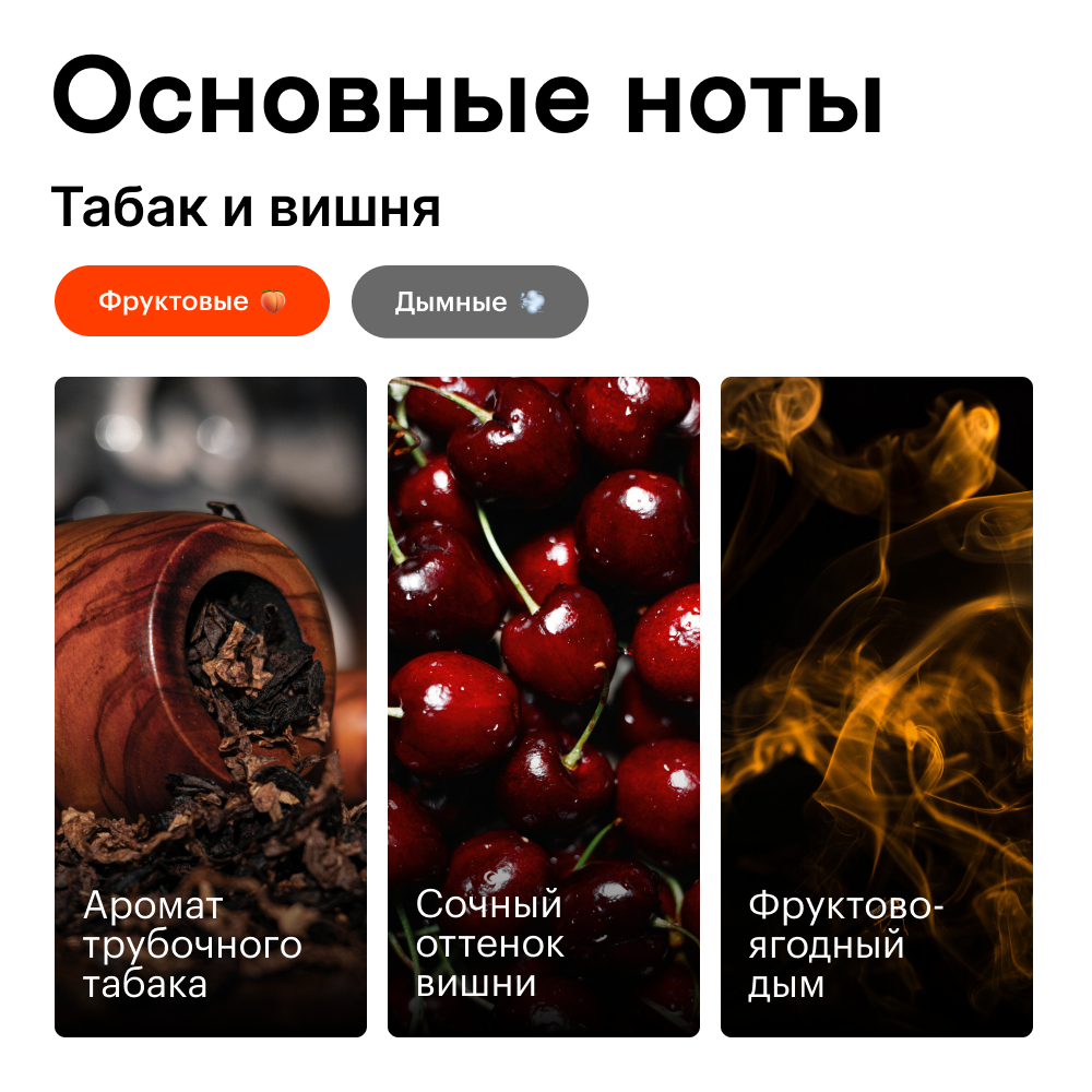"Табак и вишня" – танго внутри флакона. Она – яркая, сочная, сладкая вишня, которая падает в объятия партнёра. Он – бархатистый, смелый, обволакивающий и дымный табак, который уверенно ведёт свою партнёршу.