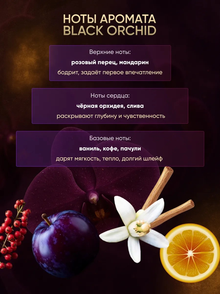 Верхние ноты аромата раскрывают ноты перца и мандарина. Сердце аромата состоит из черной орхидеи, которую дополняют гурманские ноты сливы и солодки. Шлейф раскрывается ароматами ванили и кофе, которые сочетаются с нотами бобов тонка.
