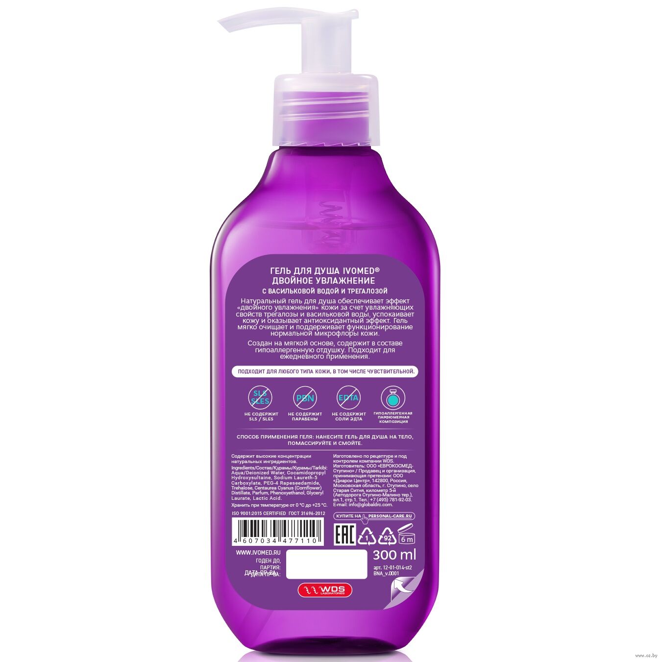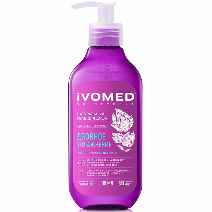 "Натуральный гель для душа обеспечивает эффект "двойного увлажнения" кожи за счет увлажняющих свойств трегалозы и васильковой воды, успокаивает кожу и оказывает антиоксидантный эффект. Гель мягко очищает и поддерживает функционирование нормальной микрофлоры кожи.